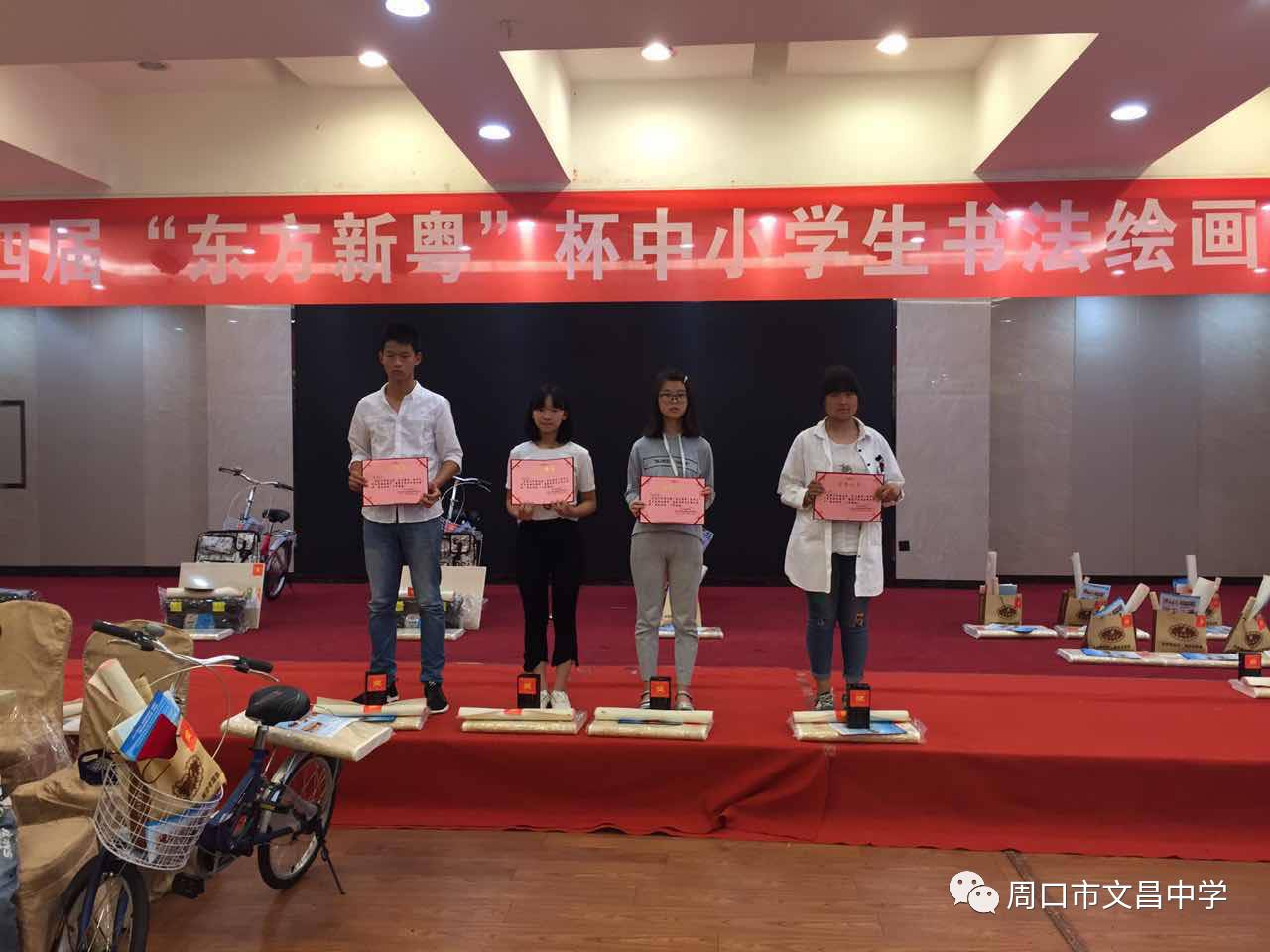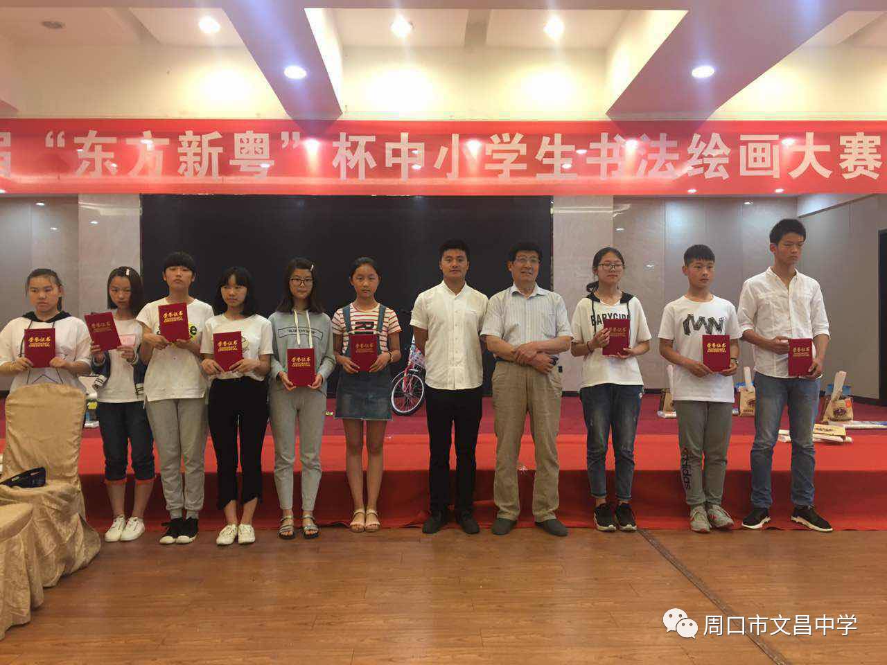 为弘扬祖国传统的书法、绘画艺术,丰富中小学生业余文化生活,展示我校少年儿童的艺术素质,促进学生书画水平的提高,周口市文昌中学由李瑞祥、王俊召老师带队13位学生,参加5月29日在粤海世家二楼举行的书画比赛,大获全胜,13人全部获奖。再次证明周口市文昌中学朱校长、徐校长、康校长倡导的一品教育及国学教育办学理念的前瞻性,学生从国学艺术教育中取得成长和社会认可,不断取得优异的成绩,八年级书法社团在杨帆主任、王俊召老师组织下,国学馆朱春雷馆长,李瑞祥老师支持下,参与书画比赛学生13人,13人全部获奖,在比赛进行中办公室叶九辉主任打电话慰问比赛情况,以下是获奖学生。12班张津芃获得1等奖,八年级5班康雨蝶、12班陆泽文、12班杨宇泽获得2等奖,12班勾媛媛、9年级8班朱佳帅、八年级1班史瑞、八年级12班张思源获得3等奖,八年级11班于鑫、1班王冉、苑露露、张鑫、杨宇泽获得优秀奖。
