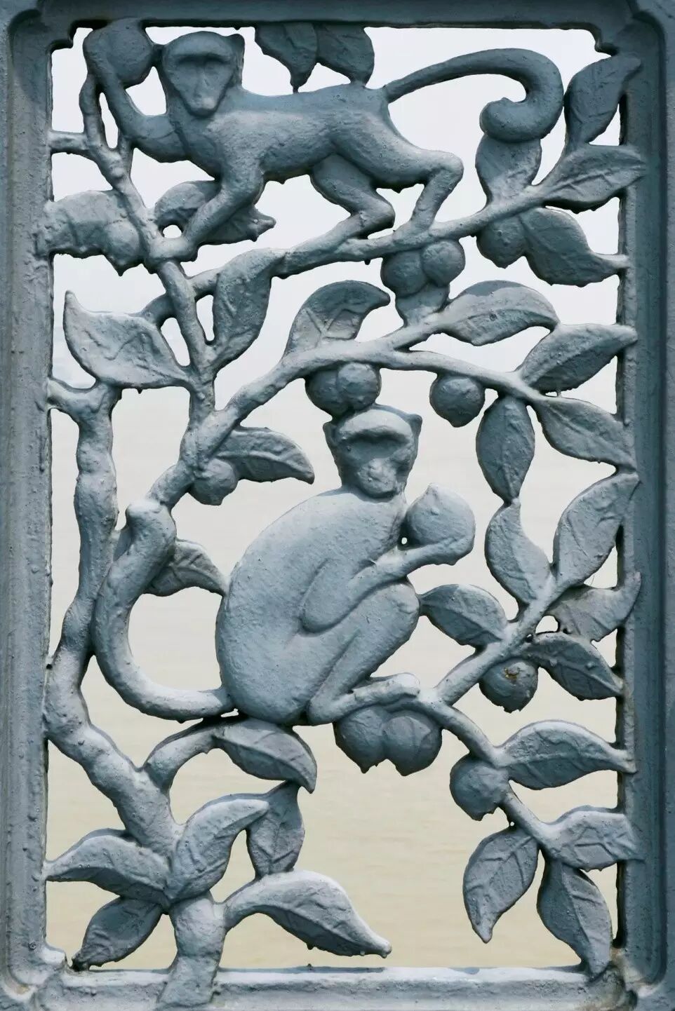 “金猴采桃”,两只活泼可爱的猴子,手捧仙桃,跳跃在桃树上,“猴”为“侯”的谐音,仙桃相传食之可长命百岁,寓意加官封侯、长生不老。