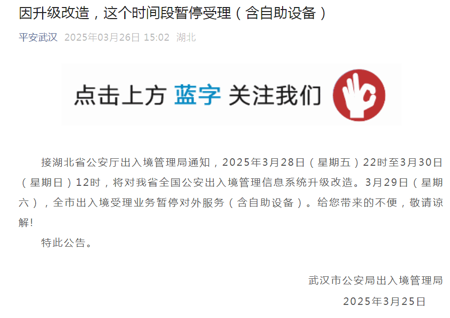 接湖北省公安厅出入境管理局通知,2025年3月28日(星期五)22时至3月30日(星期日)12时,将对我省全国公安出入境管理信息系统升级改造。3月29日(星期六),全市出入境受理业务暂停对外服务(含自助设备)。给您带来的不便,敬请谅解!
