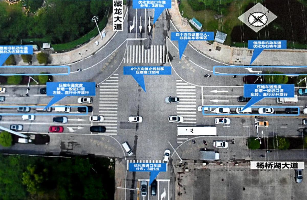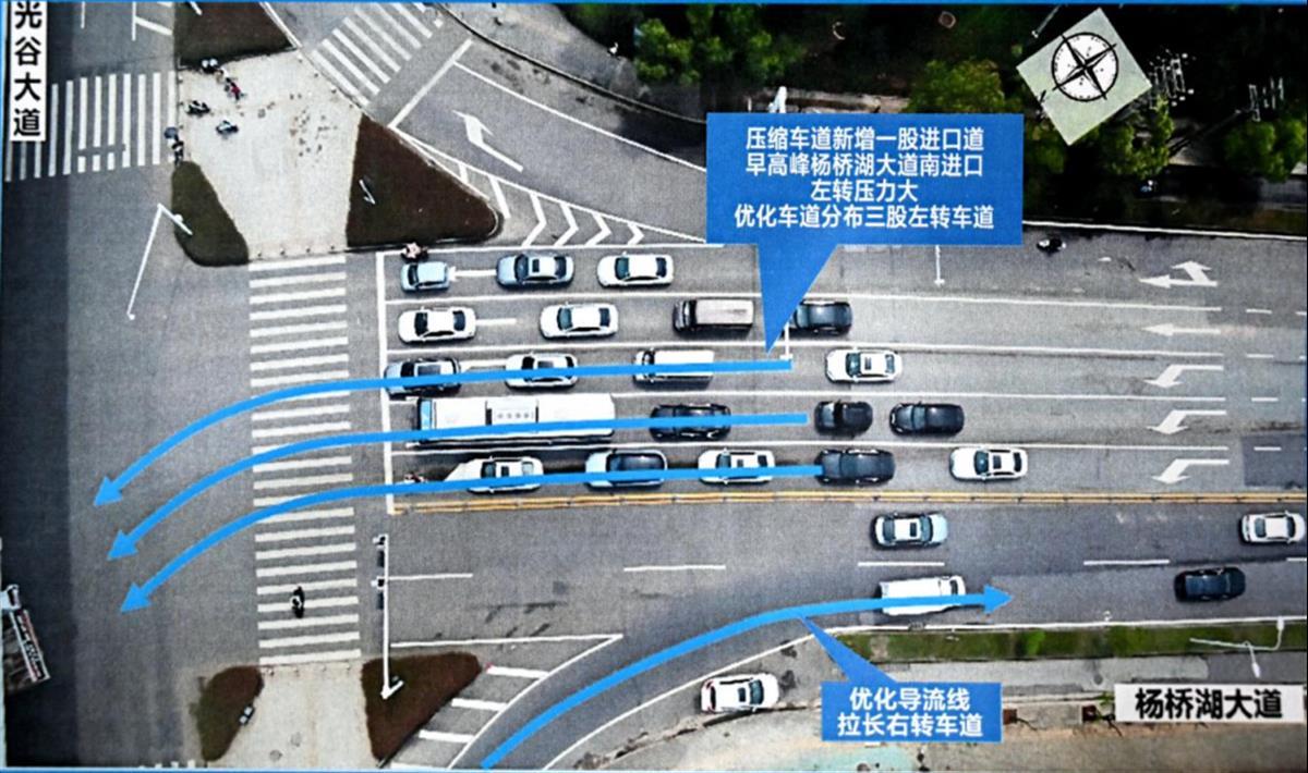 在杨桥湖大道与藏龙大道、栗庙路、光谷大道等易堵路口进行车道“瘦身”扩道,合理增减车道、压缩原车道宽度,从原先每股车道宽3.75米压缩到3米,使等待红绿灯后能有更多车辆通过。增加直行车道,提高南北向直行通行效率。对杨桥湖大道、光谷大道、藏龙大道等3个路口的导流车道进行延长,由原先的50米向后延伸至200米,引导车辆提早进入行驶车道,减少在路口“徘徊”时间。
