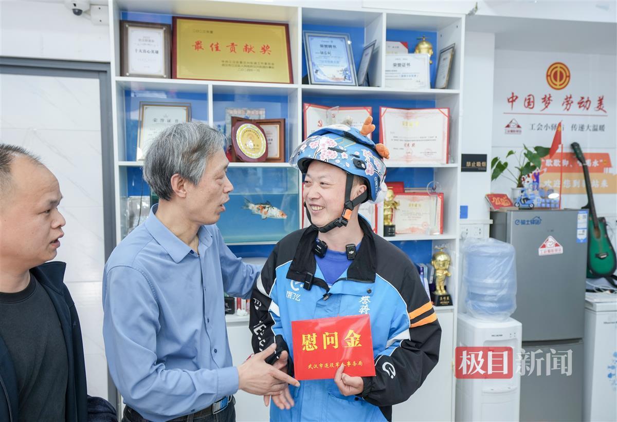 3月26日上午,武汉市区两级退役军人事务部门专程上门慰问。武汉市退役军人事务局权益处处长李细美和江汉区退役军人事务局局长程自武来到蓝骑士驿站,慰问张宝剑,并送来慰问金。