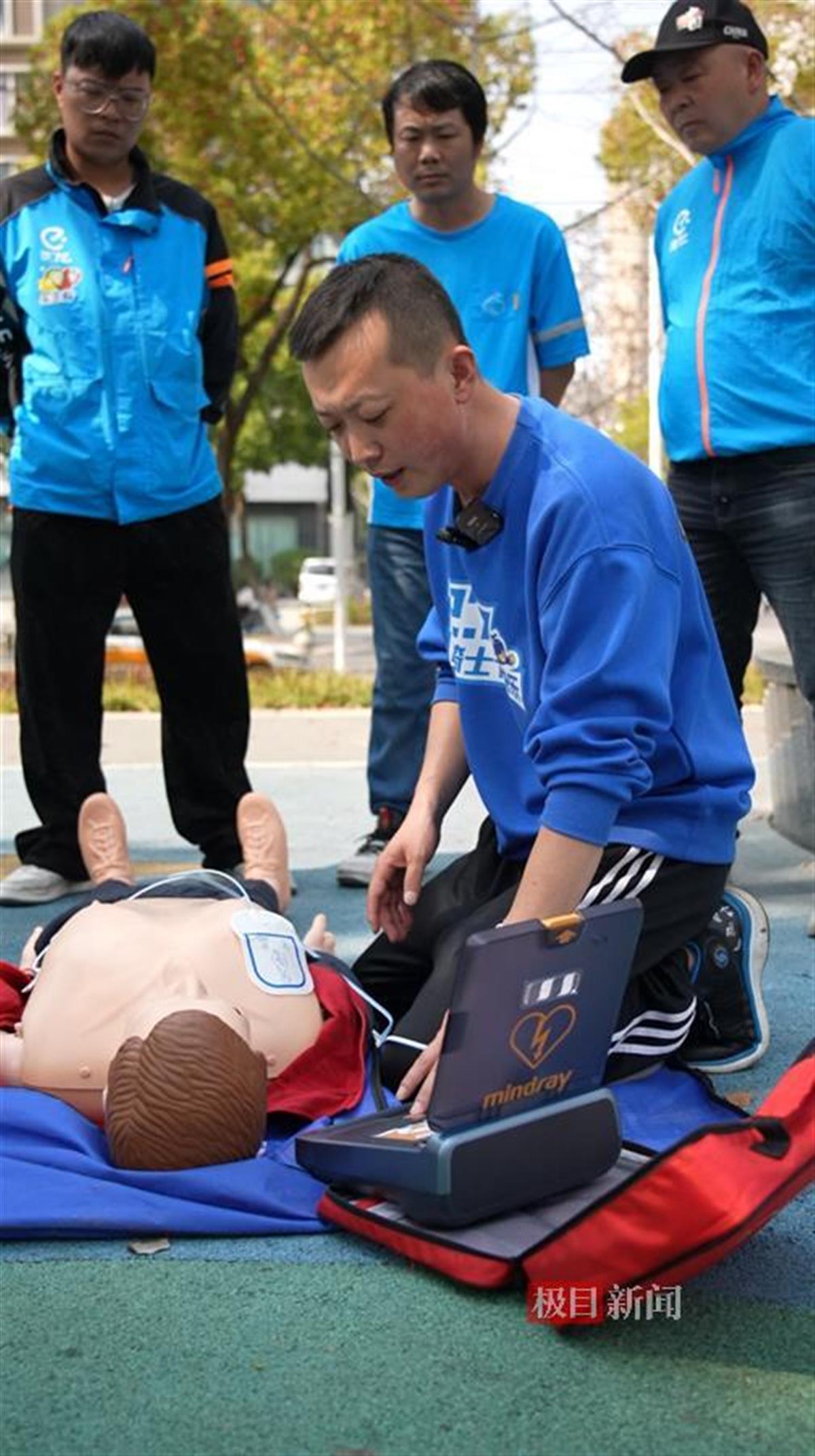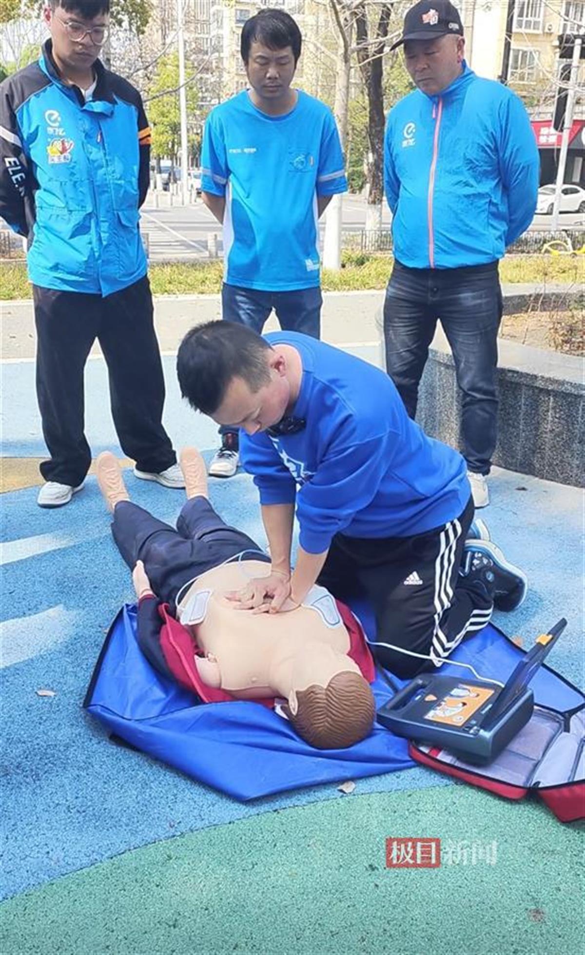 3月26日下午,新闻记者再次来到位于江汉区常青五路的外卖驿站,张宝剑正在为几名同行进行急救知识培训。