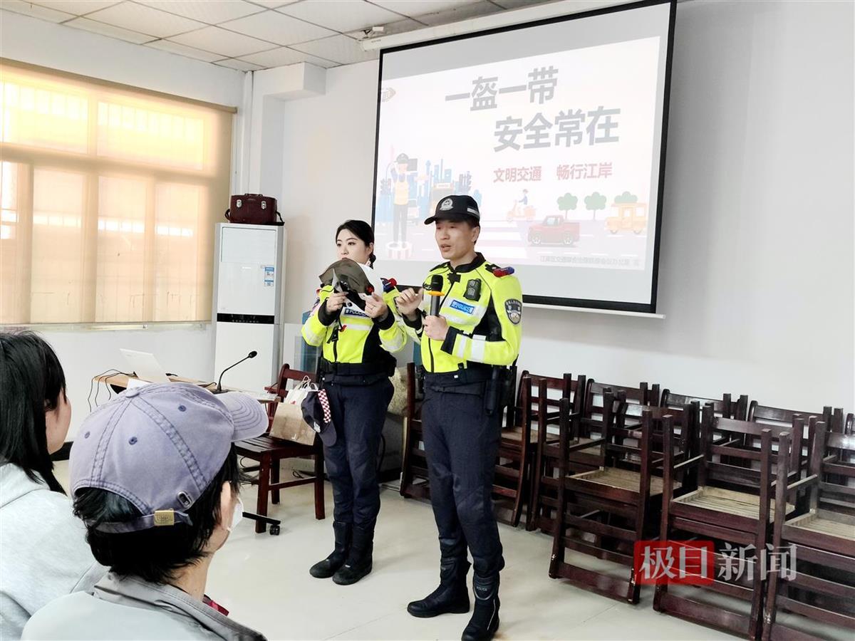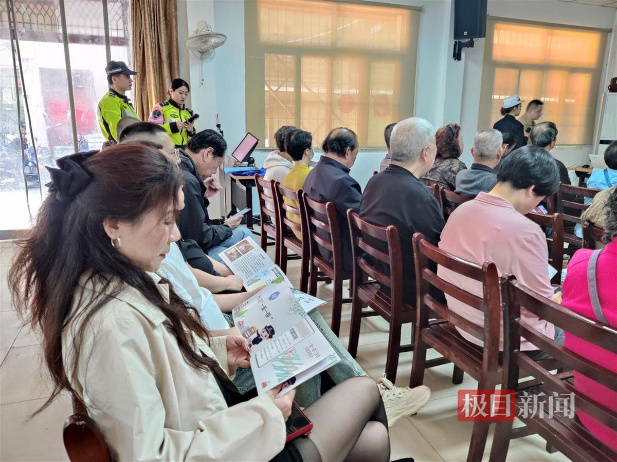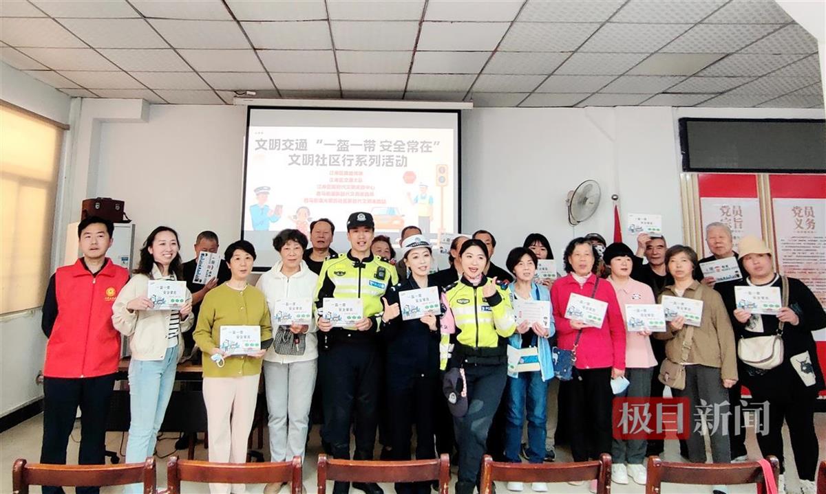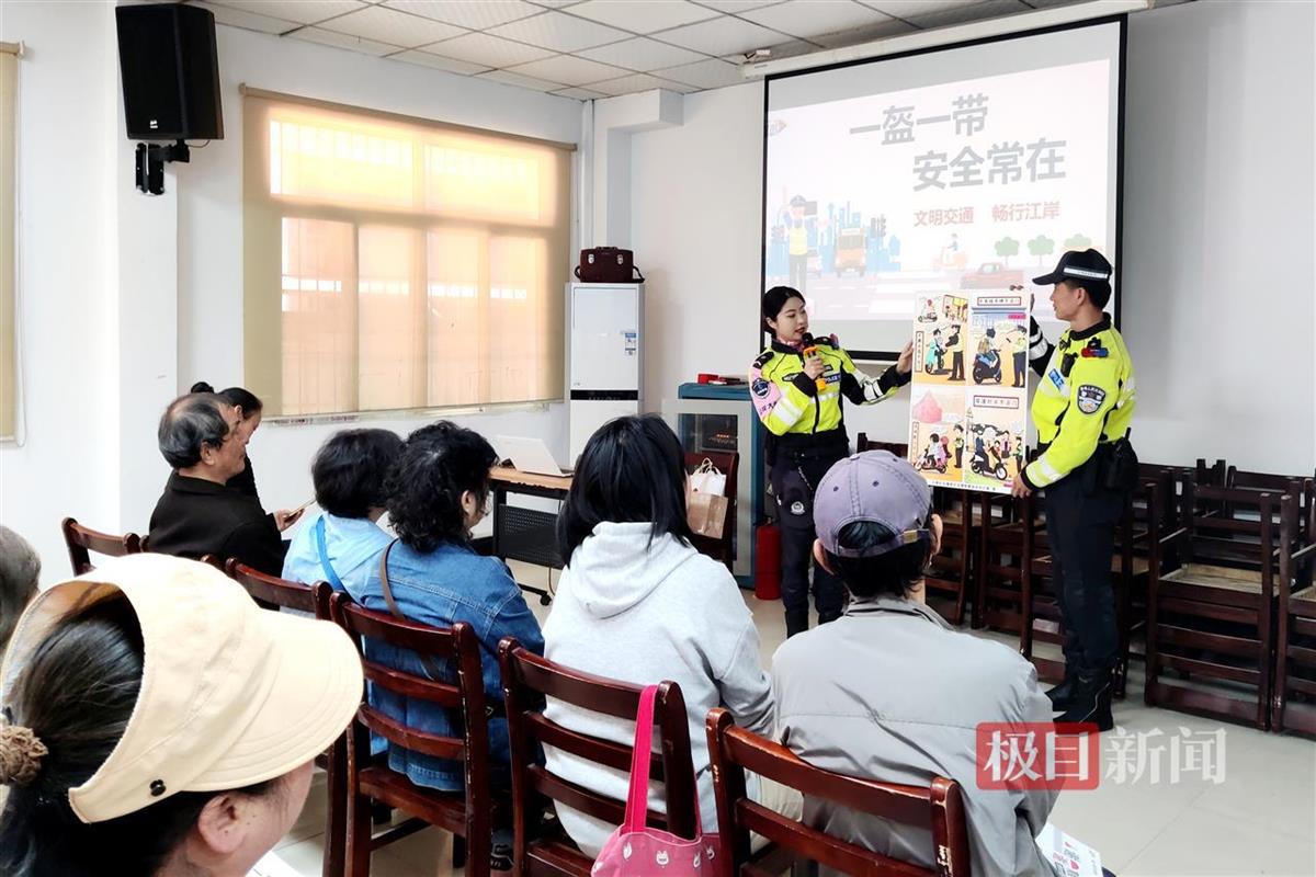 汉警快骑机动队员周海、郑蓓蓓通过分享交通手势操,以现场情景演绎的形式讲解如何安全过马路等交通安全常识,提醒老年群体在出行时要注意车辆,避免在高峰时段独自外出。他们听得认真,时而点头,时而与交警互动交流,现场气氛其乐融融。