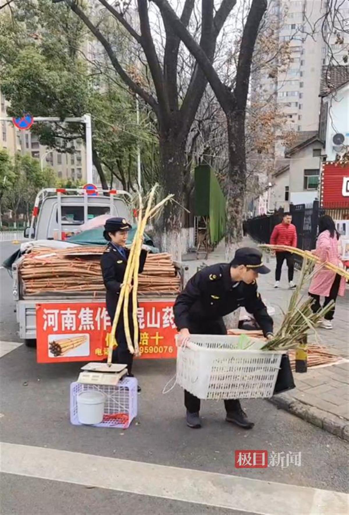 肖莉和同事一起帮小贩搬甘蔗