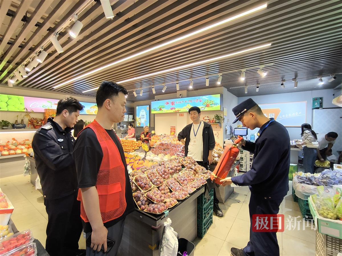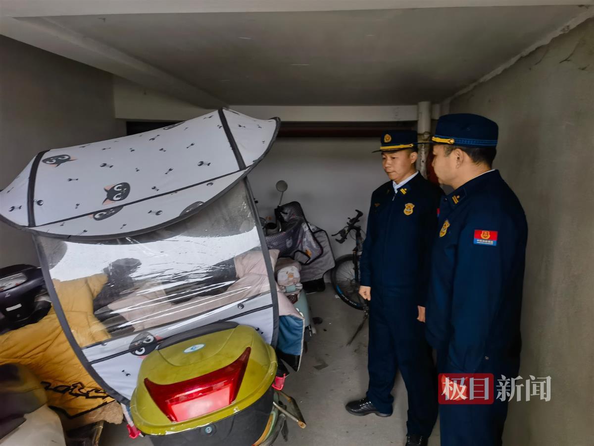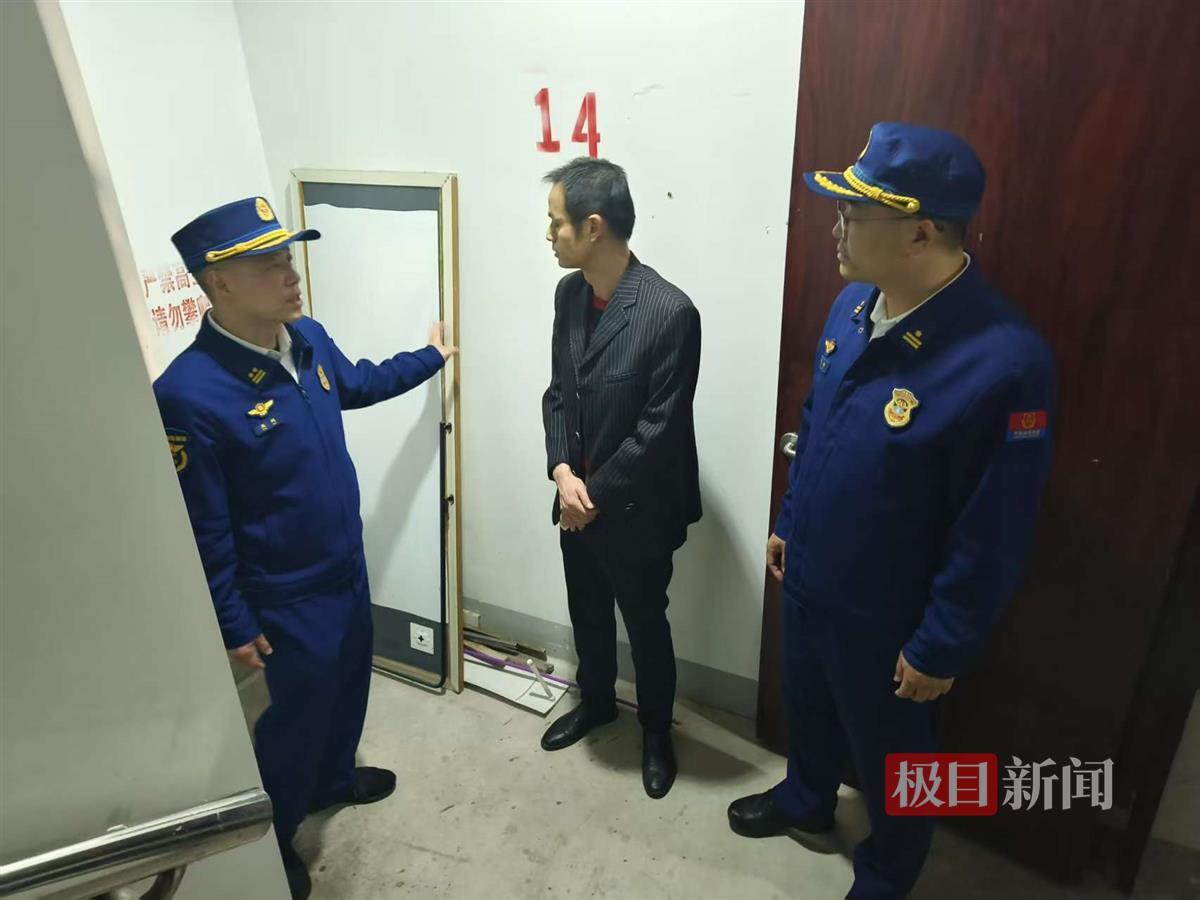 在东西湖区,巡防组到辖区“九小场所”、居民小区及“不放心”区域开展消防安全夜巡行动,重点对小区消控值班人员是否到位、消防器材是否完好、消防通道是否畅通无阻等情况进行检查。在居民小区楼道内,检查组发现存在杂物堆积的情况,消防员要求小区负责人立即整改。