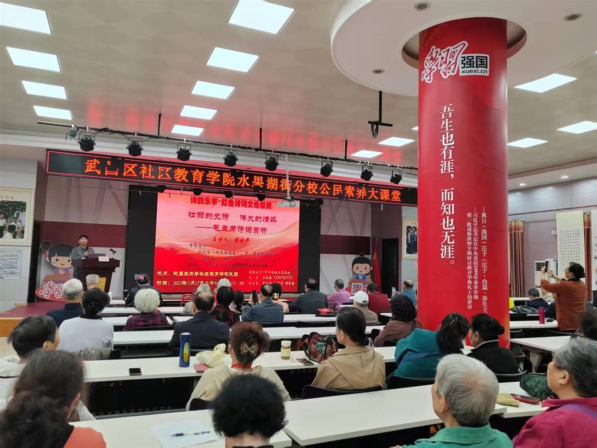 近日,武汉东亭社区组织红色文化教育系列活动,胡均华教授开展的毛主席诗词讲座,以独特视角解读《念奴娇·鸟儿问答》,为“公民素质大课堂”、“诗韵东亭”红色诗词文化教育活动注入活力。