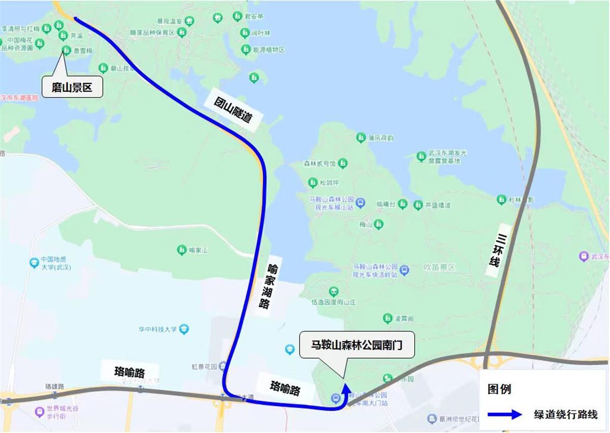 磨山景区从鲁磨路、团山路进入绿道的车辆可以绕行团山隧道,从喻家湖路到珞喻路森林公园南门进入绿道。