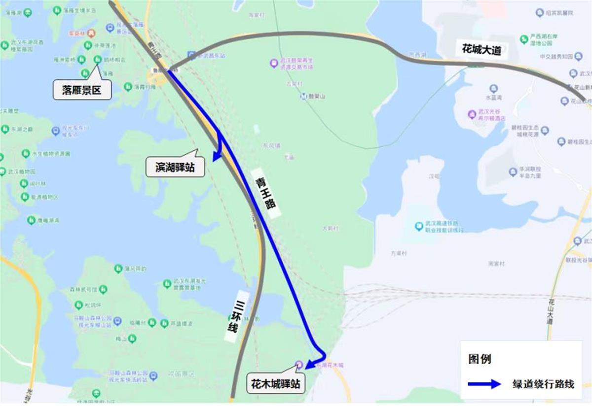 落雁景区进入绿道的车辆可以绕行青王路花木城驿站和滨湖驿站进入绿道。相对梨园和磨山两个主入口,其他绿道入口车位充足,人流车流相对较少。