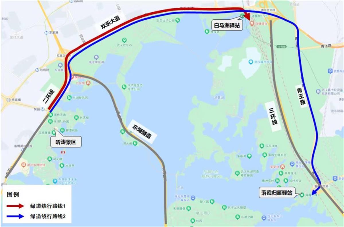 听涛景区从楚风园停车场进入绿道的车辆如遇到拥堵时,可以绕行欢乐大道从白马洲驿站进入绿道,也可以继续走青王路从落霞归雁驿站进入绿道。