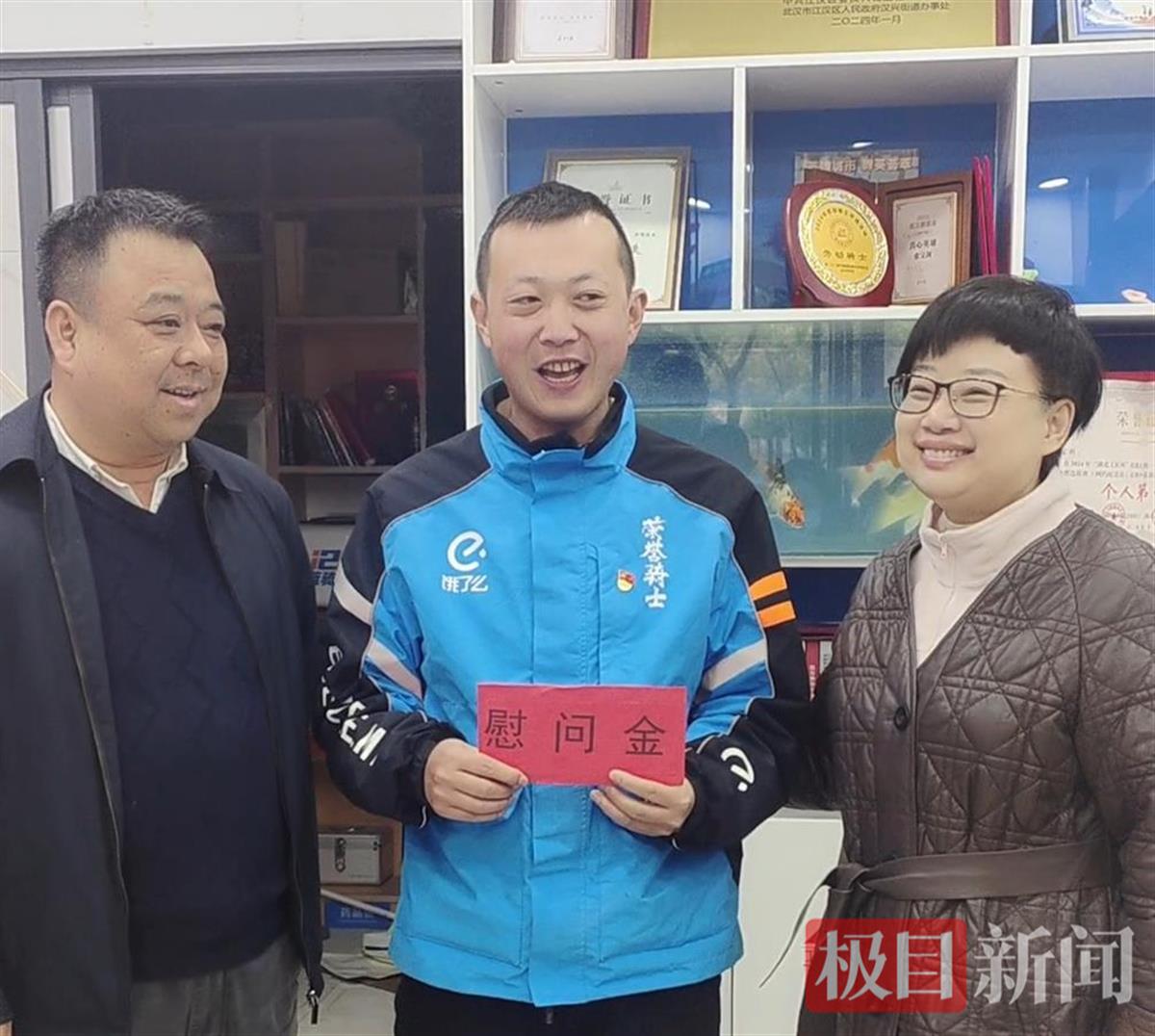 3月28日上午,武汉市江汉区社会工作部主要负责人和汉兴街道负责人一行来到外卖小哥张宝剑所在的蓝骑士驿站,对他进行慰问,并为他送来慰问金。