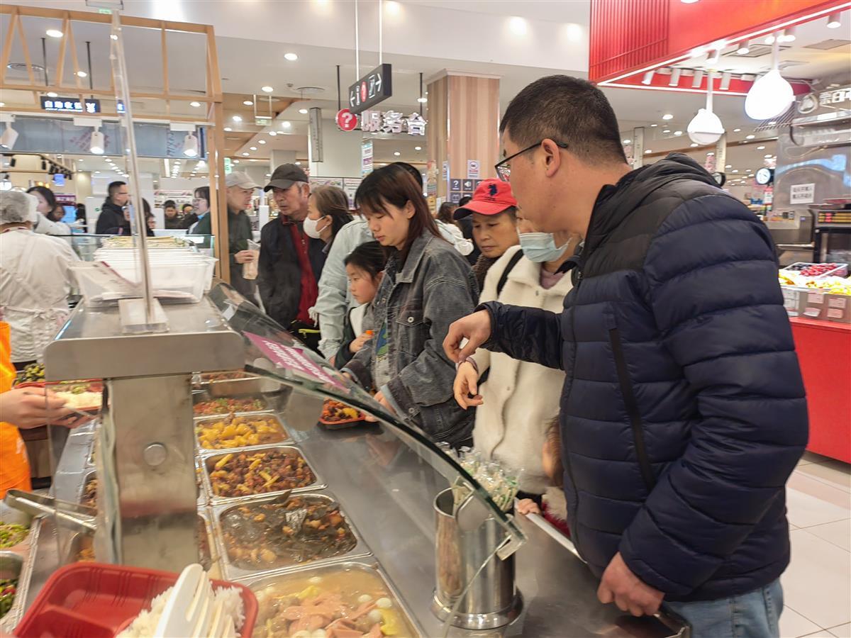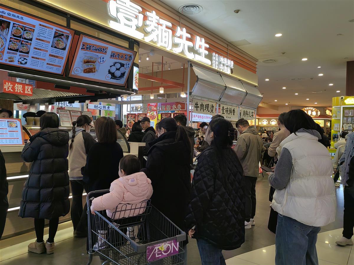 在永旺梦乐城经开购物中心,新闻记者看到,不少人带着孩子一起逛商场。中午时分,永旺梦乐城经开购物中心已经人头攒动,在一楼的多家餐饮门店前,顾客们有序排起长队等待点餐。