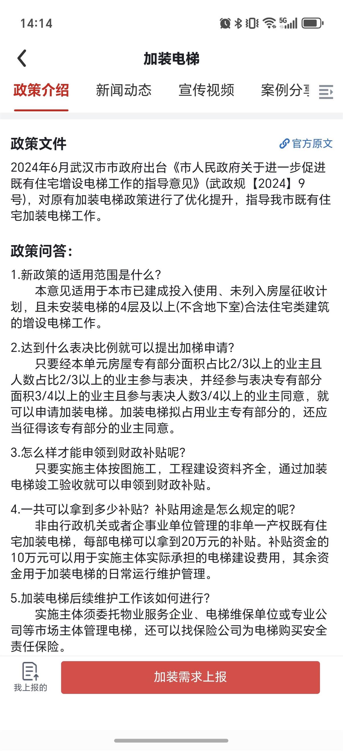 杨先生说的APP就是“安居链”,2024年12月加装电梯模块正式上线运行。居民选择该APP首页的加装电梯进入,政策介绍、新闻动态、宣传视频等版块一目了然,点击下方的“加装需求上报”即可在线申请。