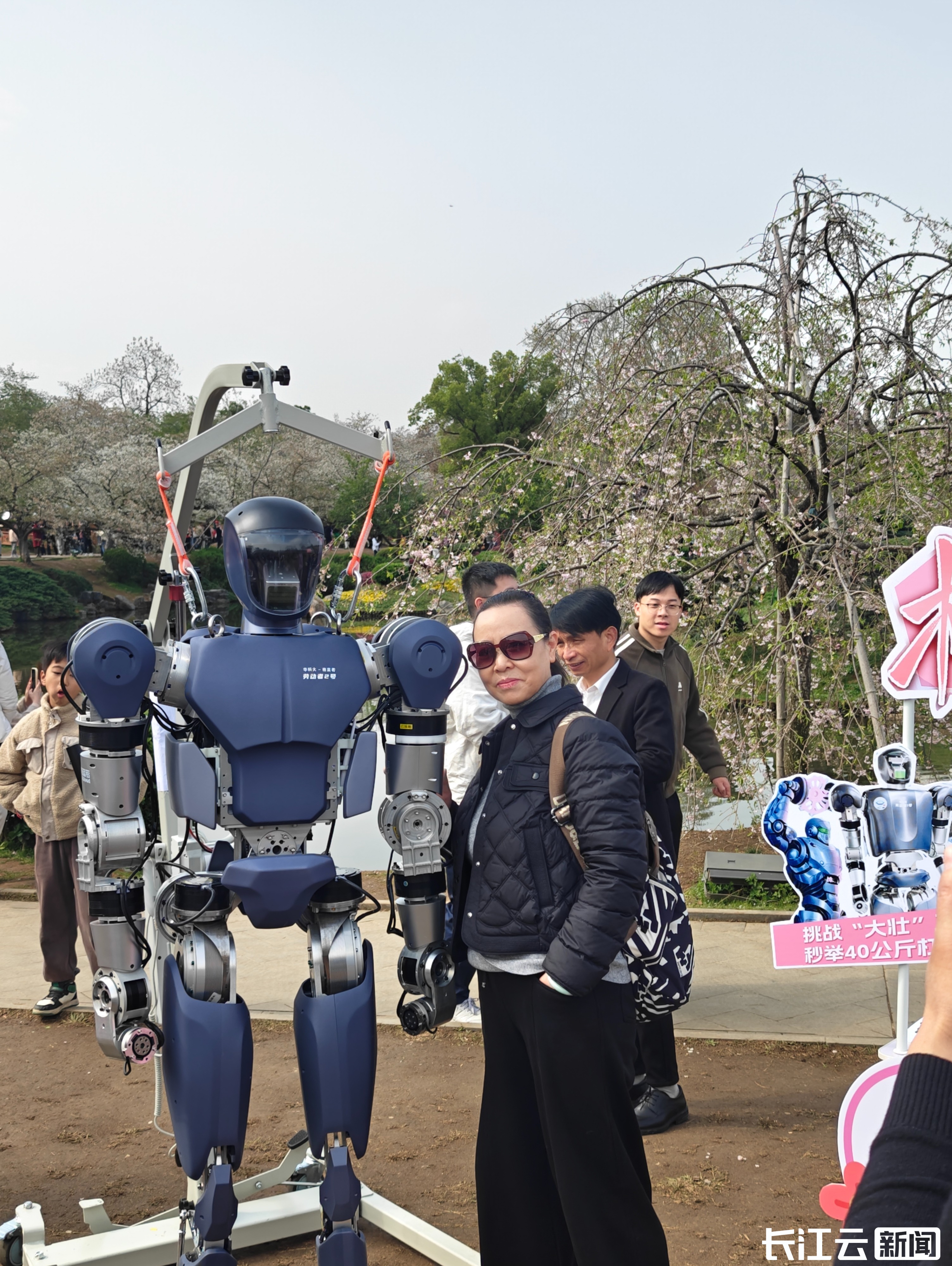 上午10点多,东湖樱园花团锦簇、人流如织,由武汉格蓝若公司与华中科技大学联合研制的三款人形机器人“劳动者”系列成为众人瞩目的焦点。“劳动者”机器人有个十分接地气的名字叫“大壮”,大壮在樱花树下一亮相,就引起了游客的好奇:“这款机器人看起来真壮实!”“可以和机器人合影吗?”“他好酷哦!”随着前来关注的游客越来越多,一场别开生面的“‘樱雄争霸’人机大挑战”开始上演。
