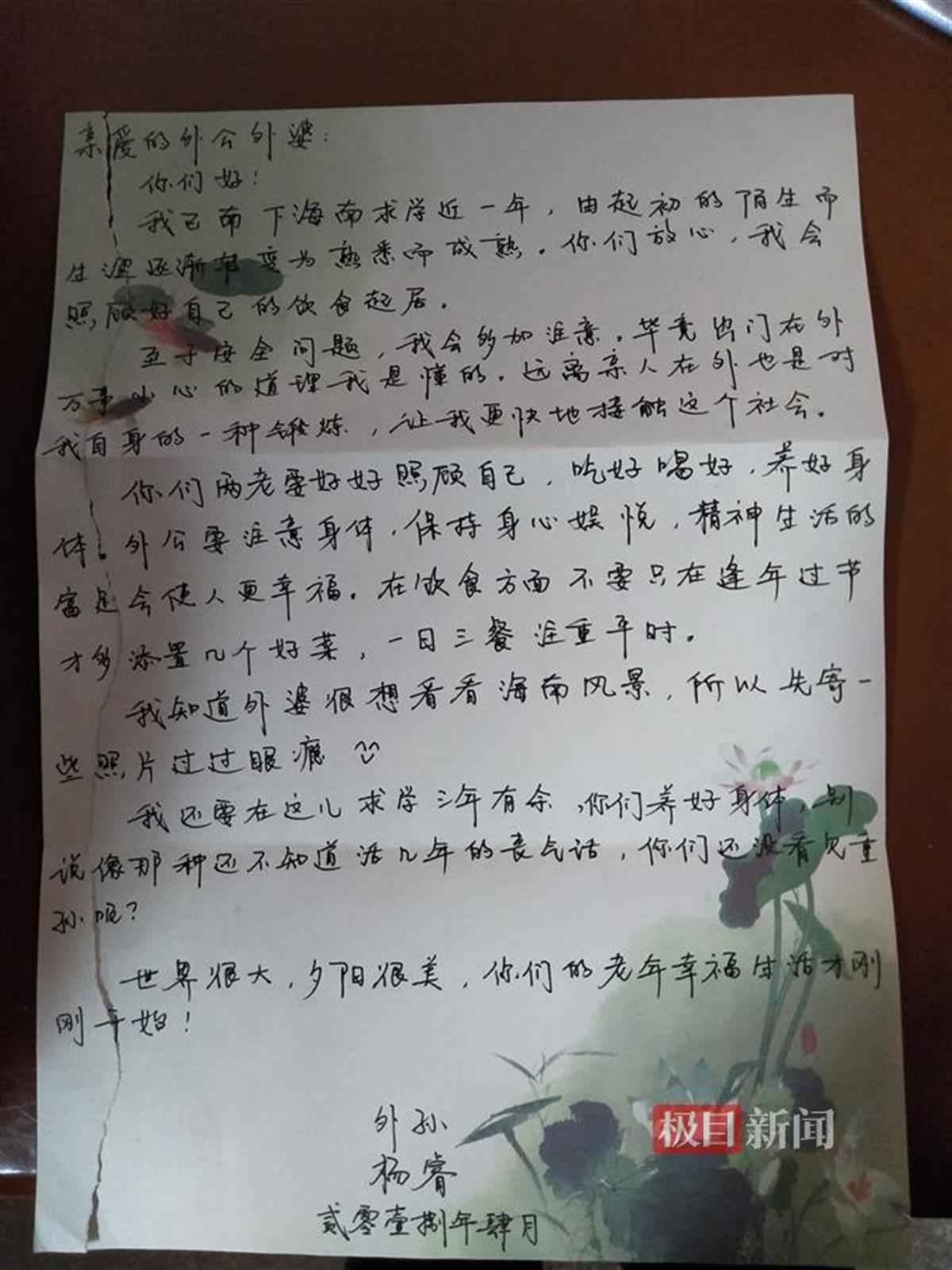 “我在海南过得很好,你们两老要好好照顾自己,吃好喝好,外公要注意身体,不要只在逢年过节才多添置几个好菜......”2018年,刚上大一的杨睿给外公写了一封信,告知自己在学校的近况,也鼓励外公与病魔顽强斗争。