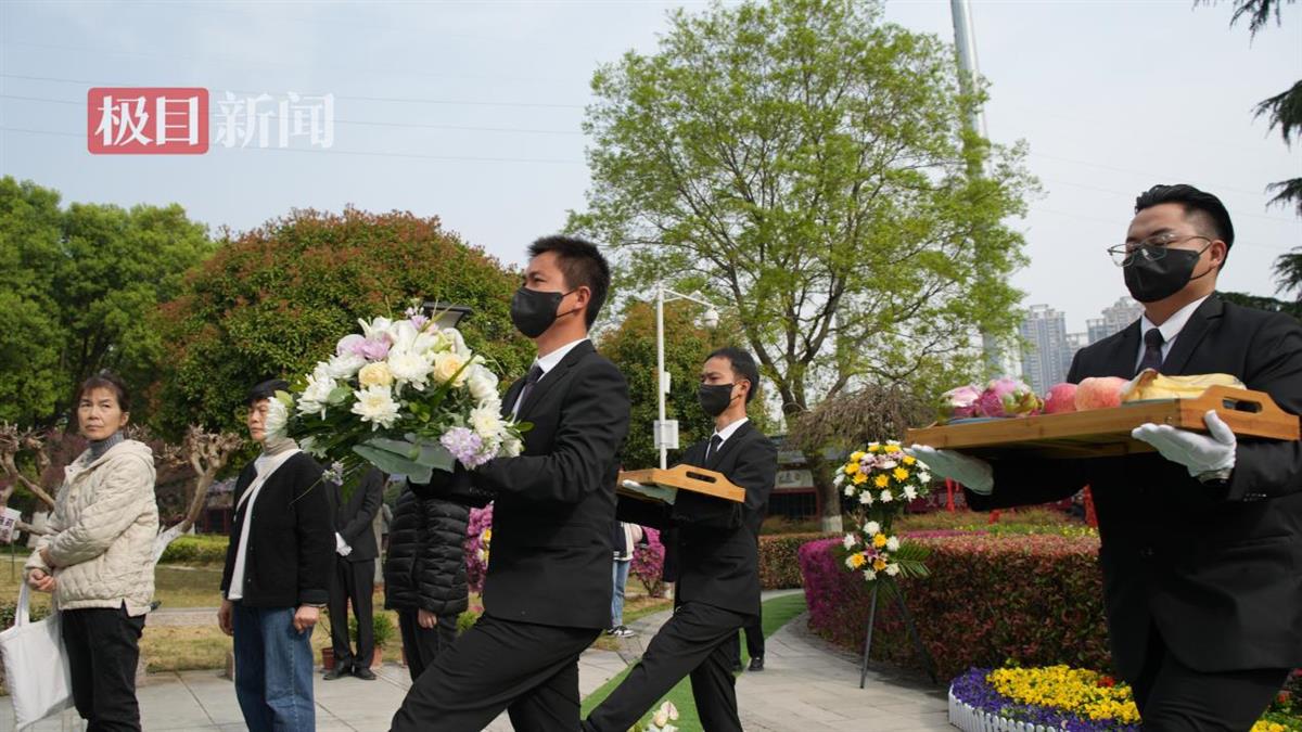 仪式在柔和的乐曲声中开启,礼仪人员列队上前,恭敬地献上祭品,司仪深情地诵读祭文,颂扬节地生态安葬的理念,全体人员向逝者行三鞠躬礼,4位逝者的骨灰在亲人的祝福中长眠于雪松树下。“今天这个公益葬礼,既省钱又环保,逝者安息、家人安心。”宋爹爹和家人在绿树下送别亲人的最后一程。