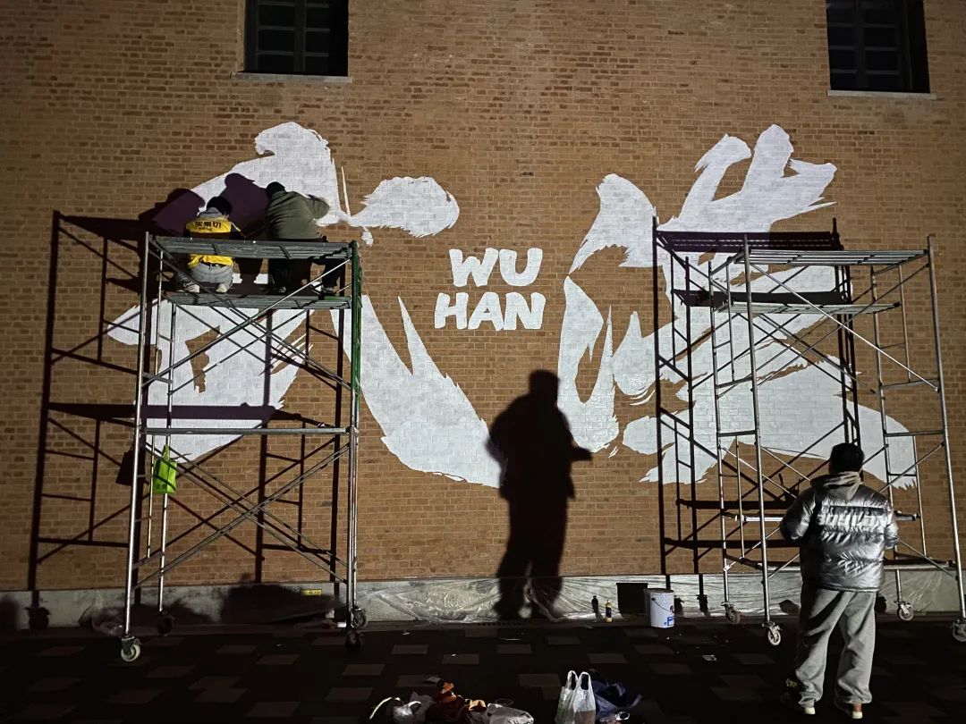 其实这面墙已经筹备了很久了,从2024年年底接到合作方的通知,对方希望能在城市留下一面让人驻足的打卡手绘墙,于是经过反复沟通,最后他们决定选用了当下流行的国潮文字图案——“武汉”字样,并配上对应字母。