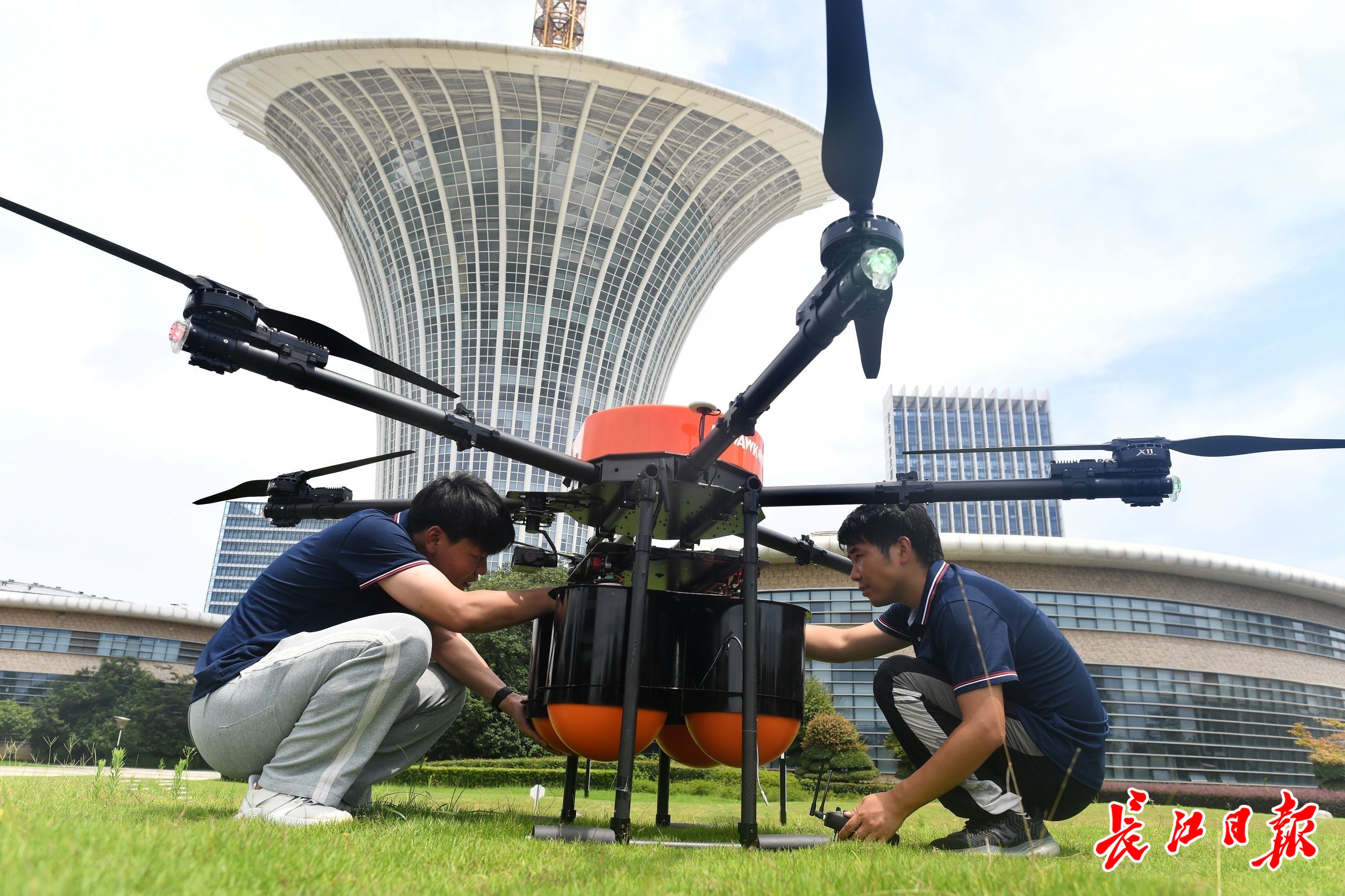 电鹰科技的研发人员给EHM-2200大载重无人机做起飞前的准备。周超 摄