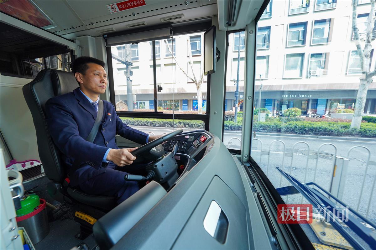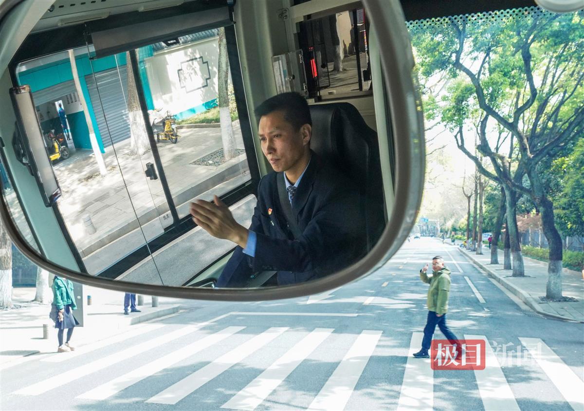 刚驶出停车场不久,车辆即将左转,在距离前方斑马线二十多米的地方,记者就已经感受到车辆已悄然减速,李旺富说,“遇到斑马线主动减速,对我来说,已形成肌肉记忆,成为一种本能反应。”公交车行至阳新路与拦江路交会的路口,李旺富在人行道前的斑马线处稳稳停车,微笑着向站在路边的两位行人挥手,示意他们安心通过。