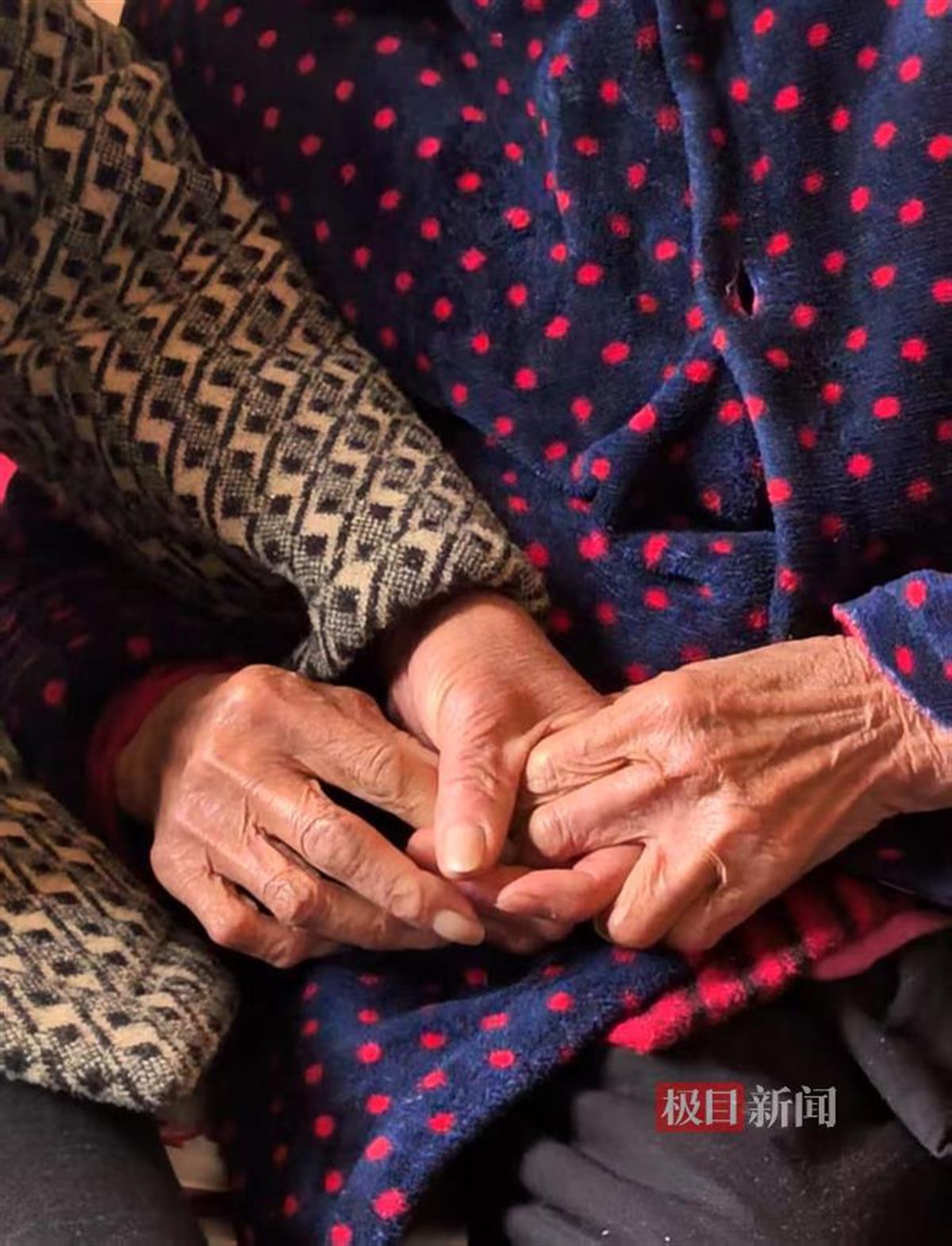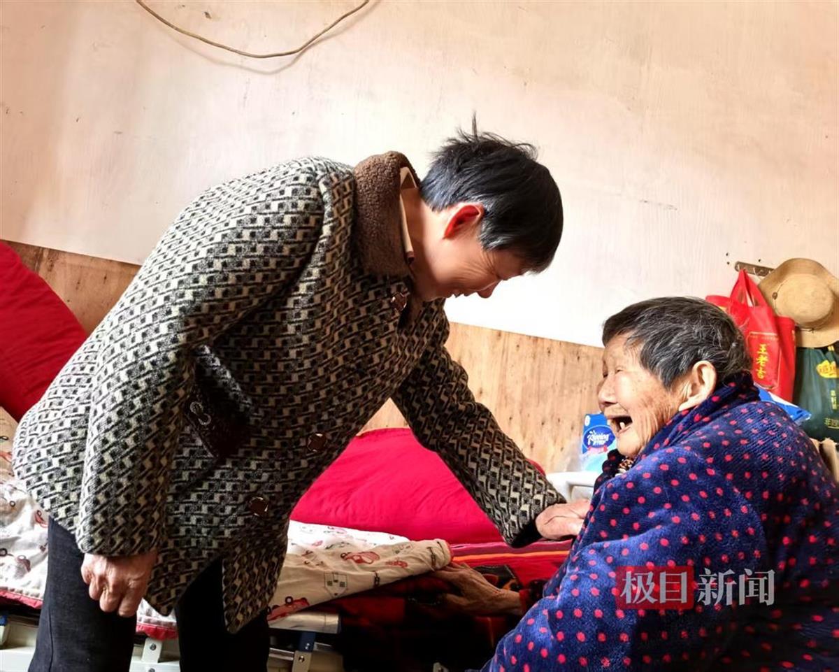 朱美英俯下身子,凑到婆婆耳朵旁,告诉她不要害怕,是关心她的人来看她了。听见儿媳熟悉的宽慰声,张作英放松了戒备,露出了开心的笑容。