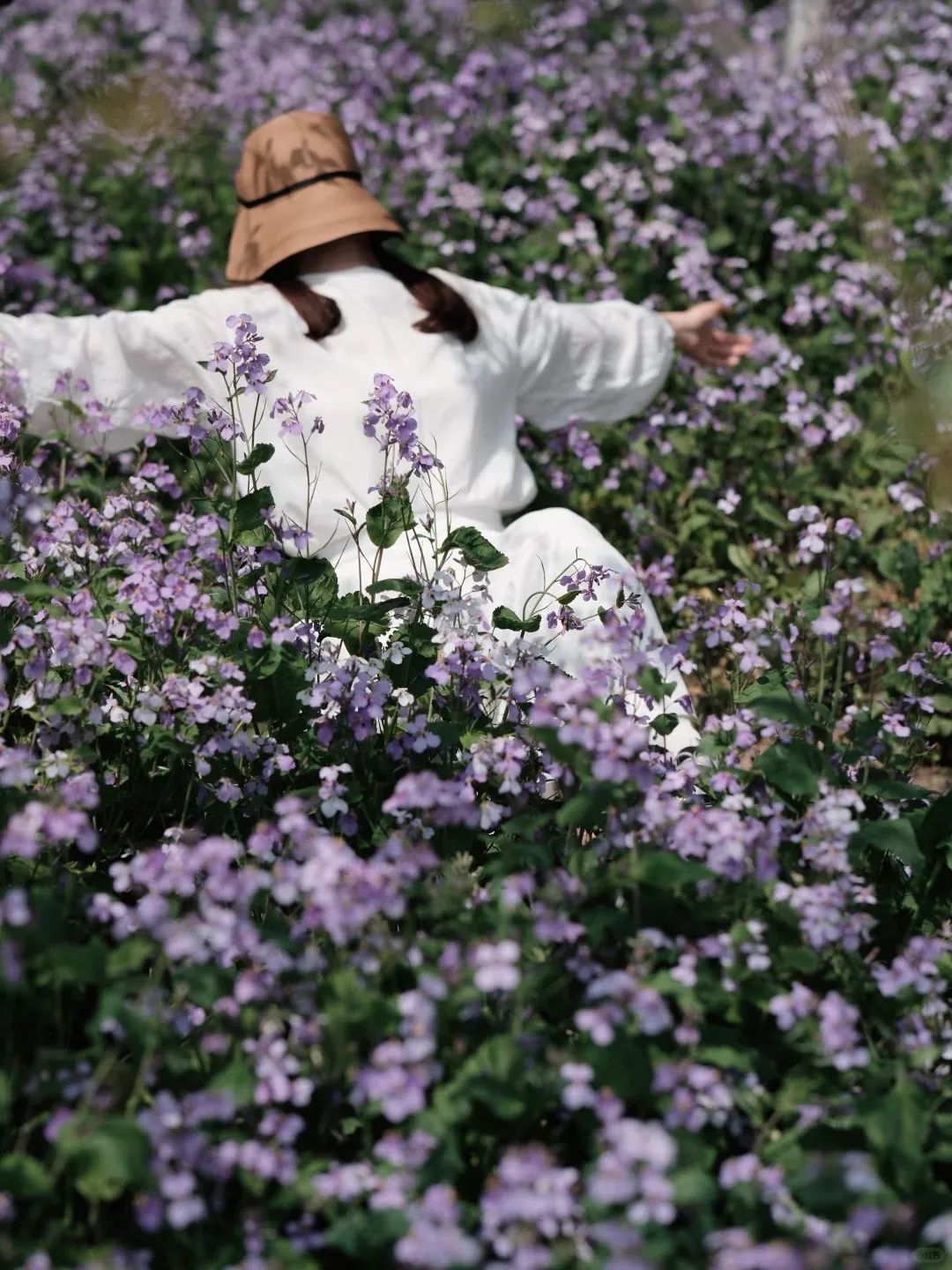 拍摄二月兰有技巧,找长在缓坡上的整片二月兰,走进花海深处,让花海成为背景,接着就尽情发挥摆出春天的pose吧!
