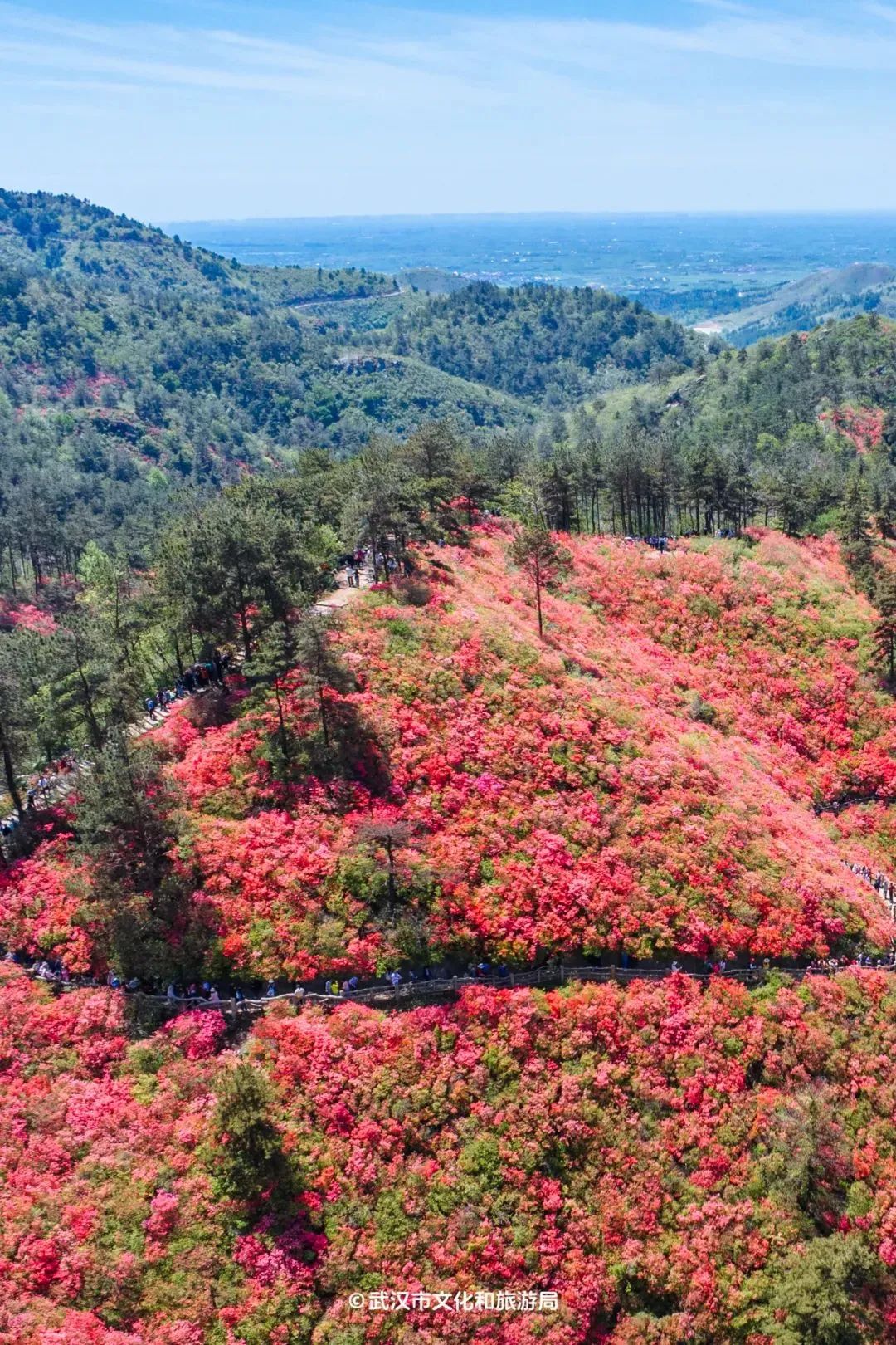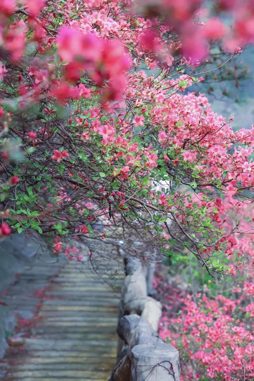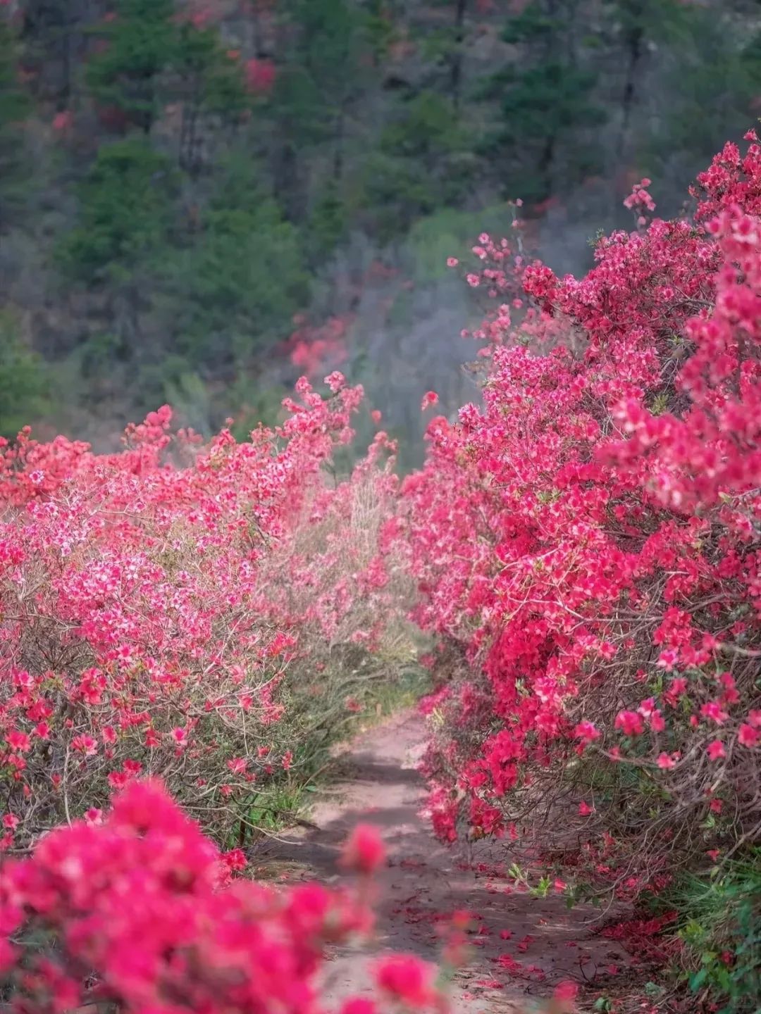 现在是杜鹃盛花期,山上万亩野生杜鹃花怒放,花期一直持续到5月初,三座山头披上娇俏的红衣。