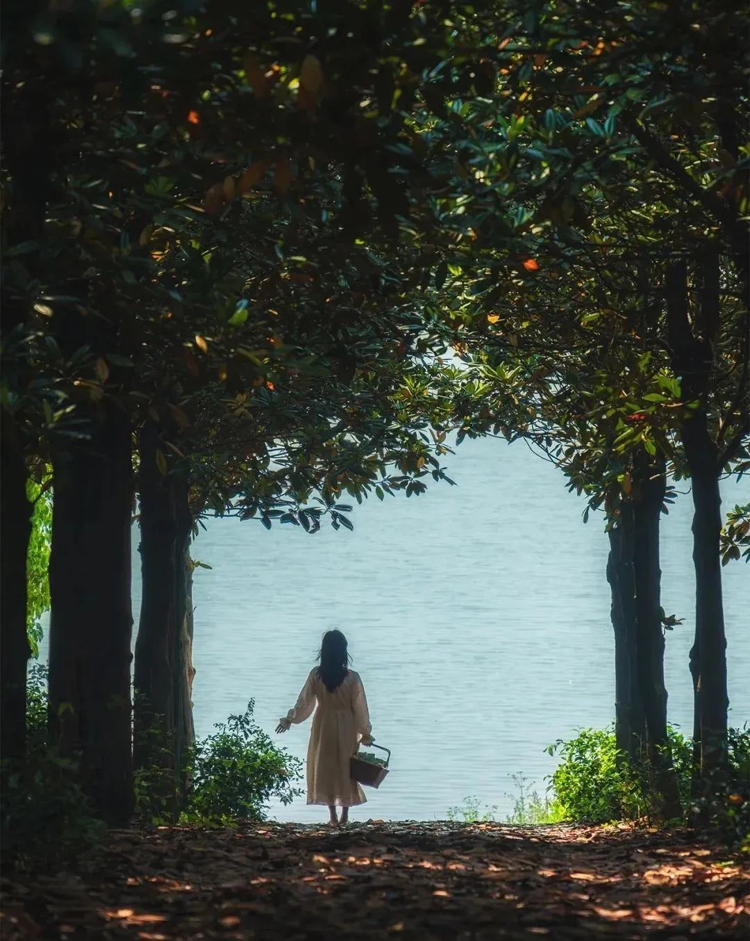 树林,阳光,道路尽头的“海”,像动漫里的场景,前方是更开阔的湖岸线,支一顶帐篷听风看海,看日余晖在湖面上折射出光芒,纵情享受无人打扰的宁静与美好。
