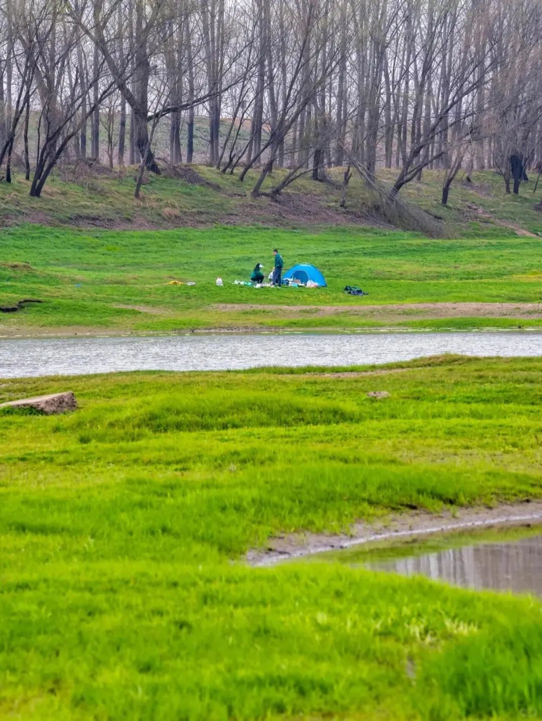在城市忙碌的家庭带着天幕、桌椅和萌宠在河边戏耍在草浪间,喝春茶赏春景,感受亲野乐趣。
