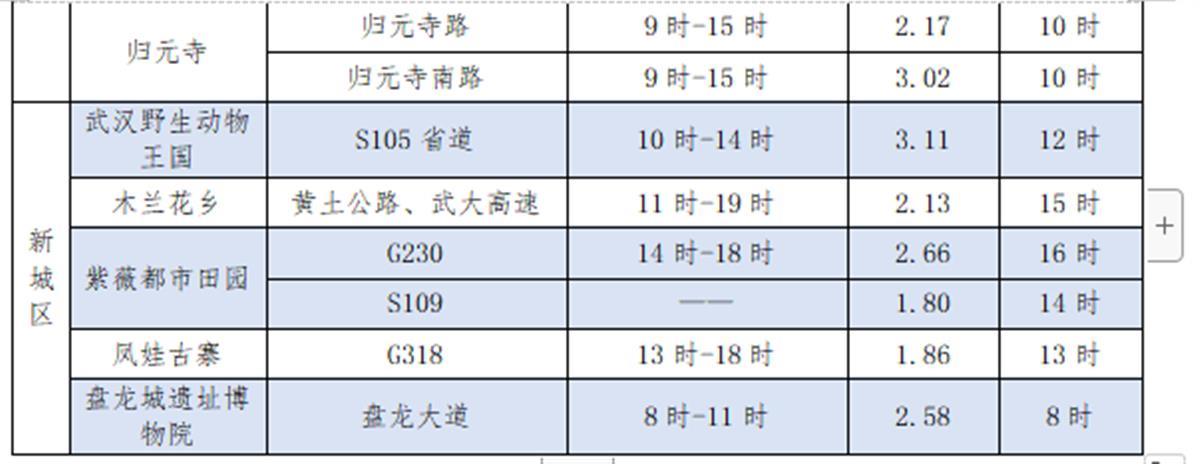 其中,东湖磨山景区鲁磨路一带每天9点到18点,省博物馆门前的东湖路每天9点到17点可能会比较堵,龟山风景区龟山南路和北路每天12点到18点拥堵情况较为突出。