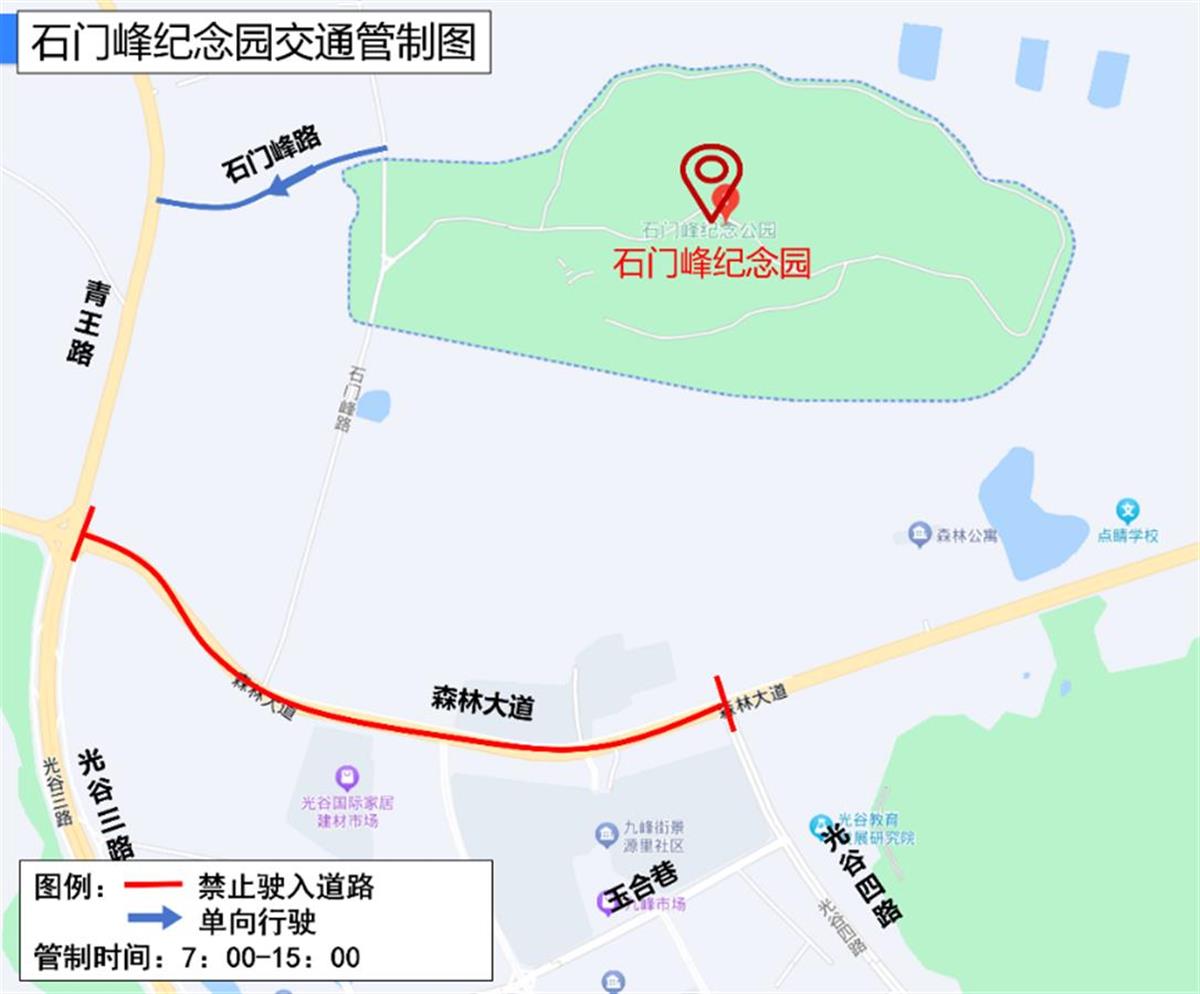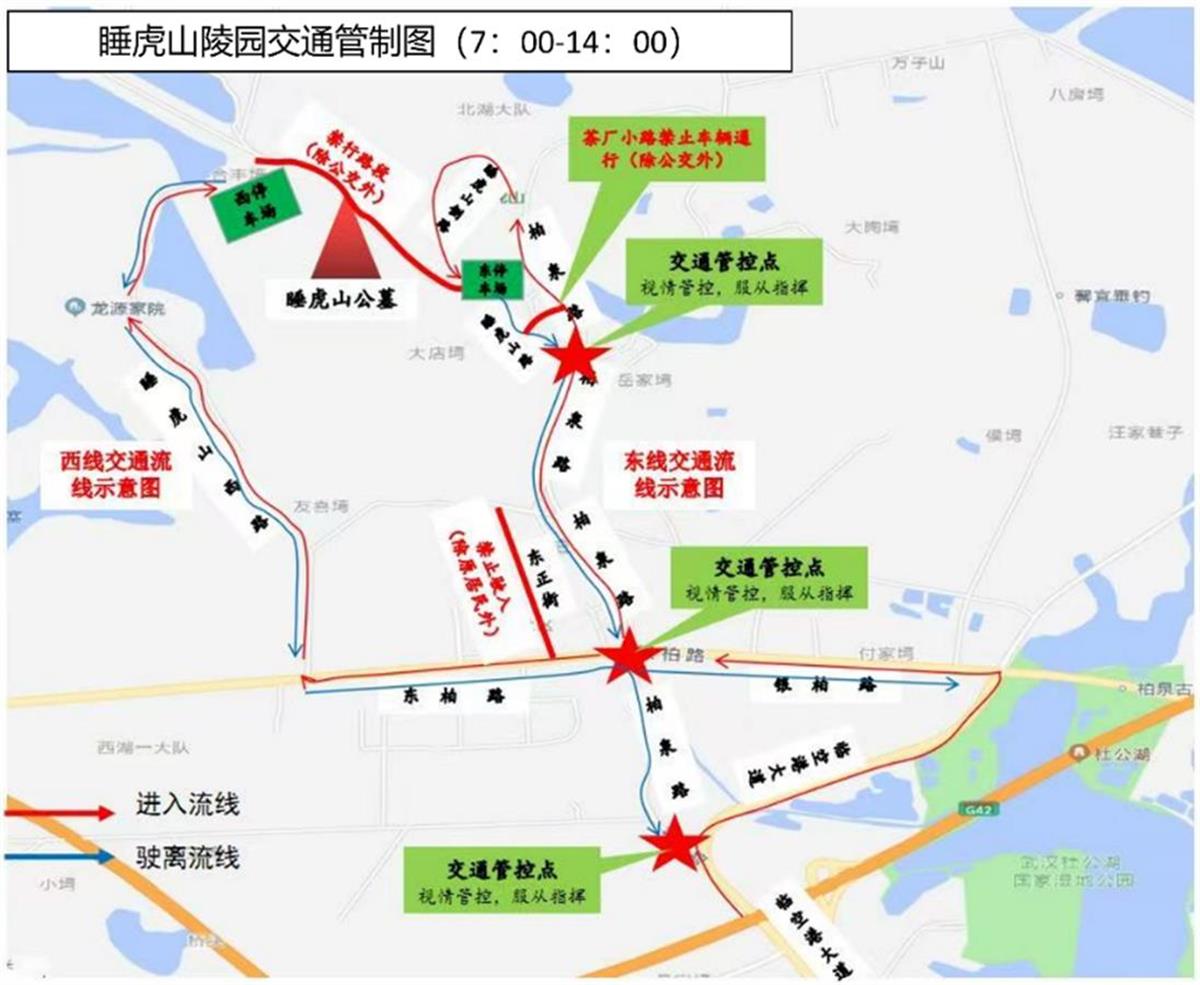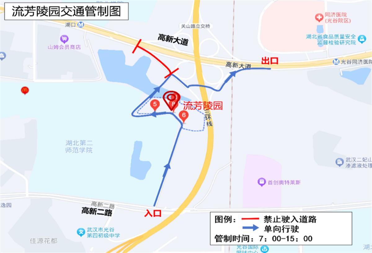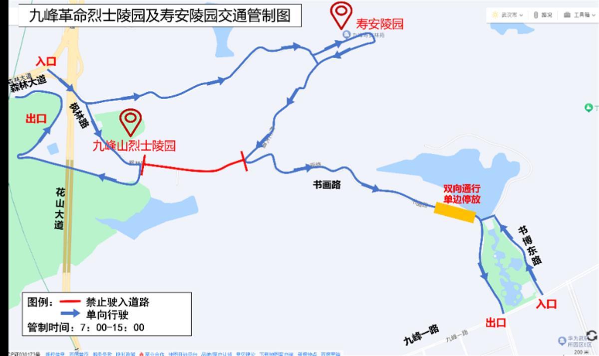 ●管制措施:幸福山公墓周边的天子山大道(101省道至沪渝高速公路桥南侧桥头)禁止机动车通行(公交车除外),花宁线李三捡湾猪场三岔路口封闭东侧路口,禁止机动车进入园区,花宁线幸福水库入口禁止机动车及行人通行。万福净土陵园周边的潘庙陵园村道实行北口进、南口出单向通行,柴泊大道(翔飞路至尤加石化加油站)禁止重中型货车通行(公交车除外)、金发大道(平江大道至余泊大道)、平江大道(青花路至金发大道)禁止大中型货车通行。