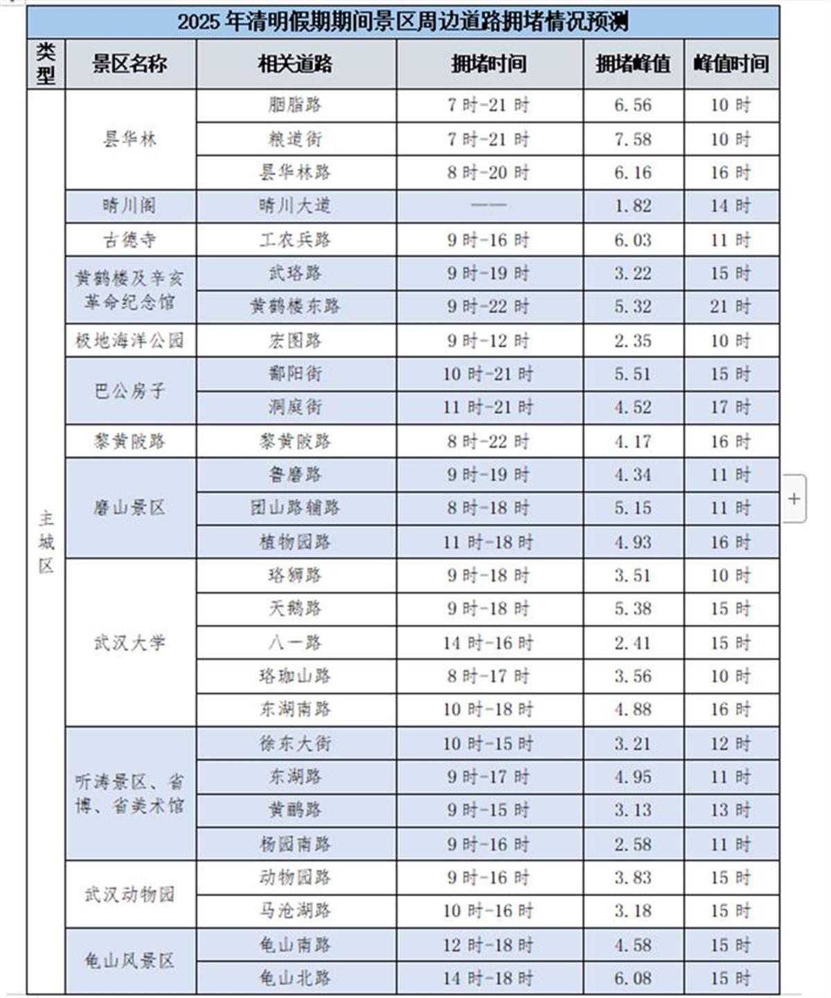 “双峰叠加”:祭扫人流集中在上午7:00-15:00,踏青游客则集中在9:00-17:00,市内快速路(如常青路高架、光谷大道高架)及墓区周边道路(如汉阳大道、森林大道)将面临双重压力。