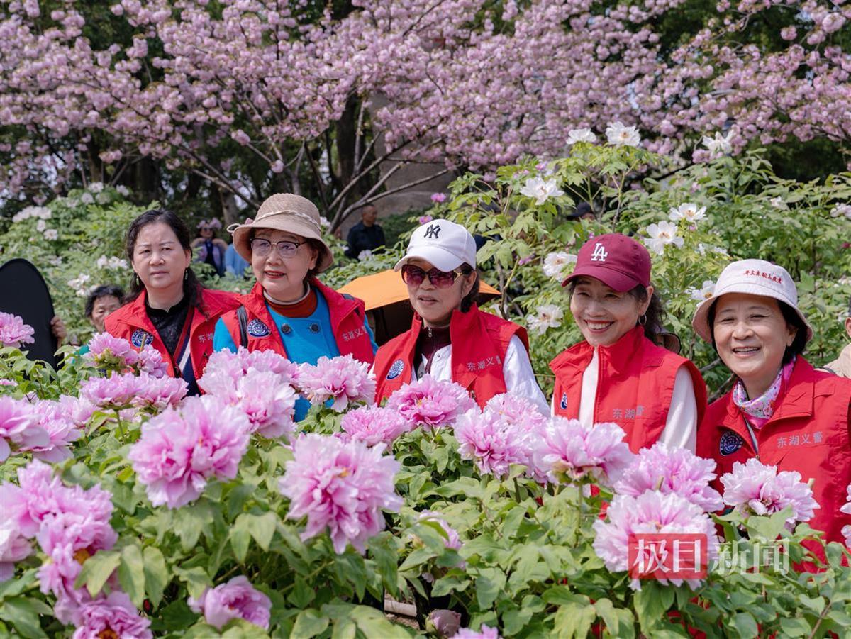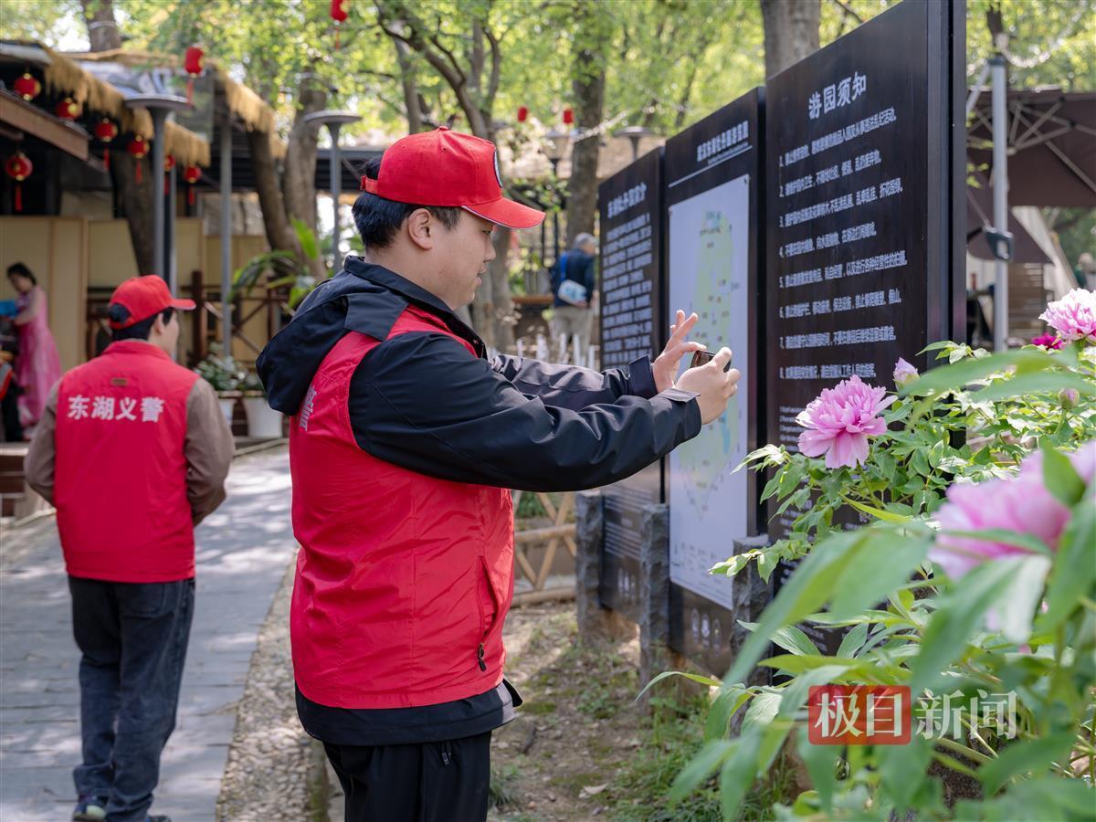当日上午9时30分许,新闻记者来到东湖牡丹园入口处,已经有很多游客在排队入场。身穿东湖义警红色马甲的志愿者,有人在给游客做指引,有人在询问东湖公安民警如何兑换积分方便入园。