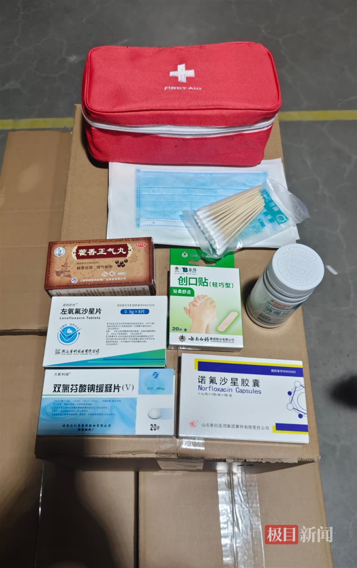 新闻记者现场看到,该批物资主要由1万个爱心急救包组成,急救包中包含了消炎、止痛及治疗和预防感冒、疟疾的药品,也有口罩、棉签、消毒片、创可贴等在内的基本医疗用品,种类接近10种,统一打包装箱后,集中运出。