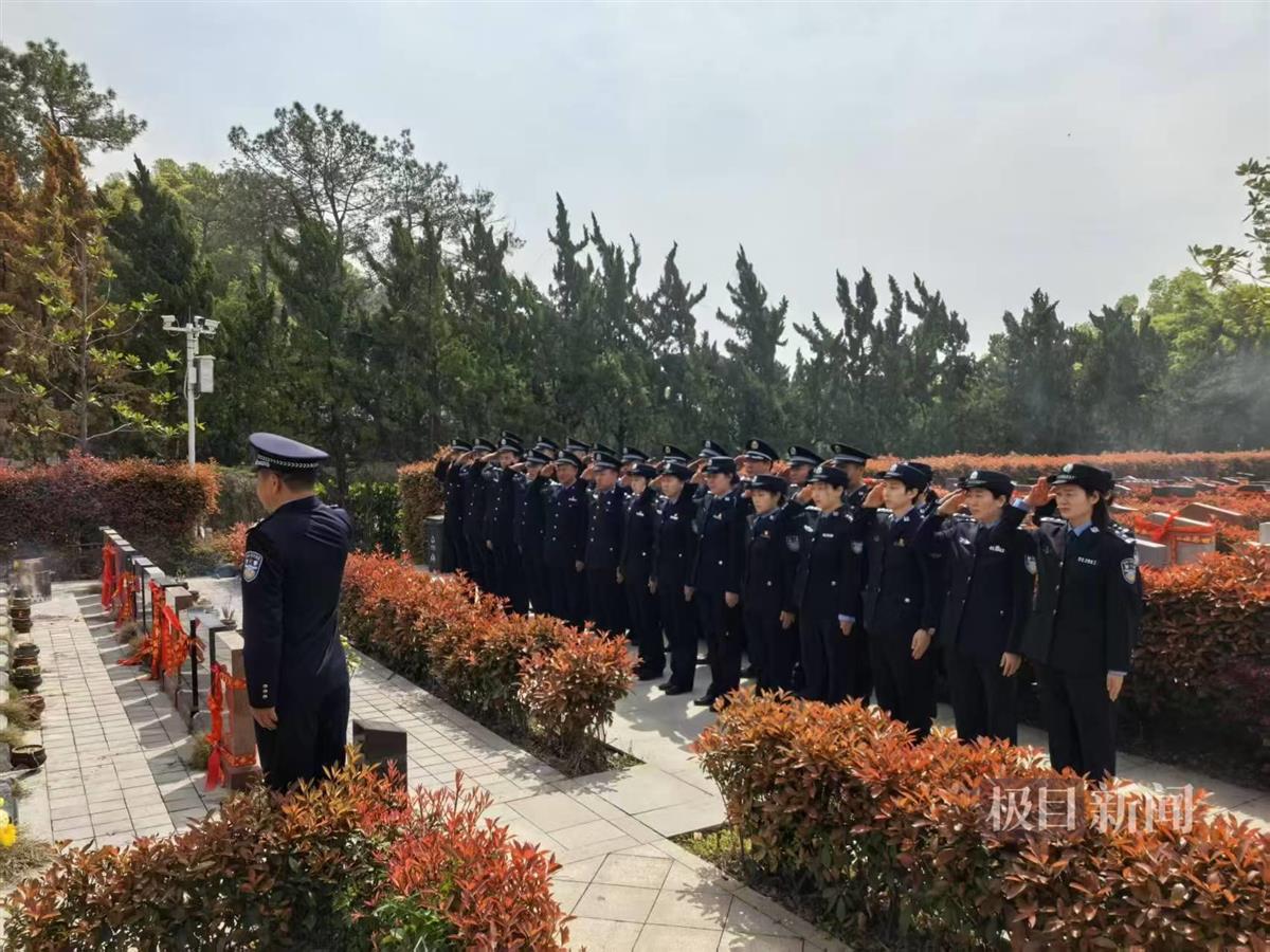 当日9时许,玉笋山陵园内气氛凝重,寄托哀思的白菊在微风中轻摆。青年民警们警容严整,队列整齐。在闵飞的墓碑前,随着一声令下,全体民警集体脱帽,垂首肃立默哀。