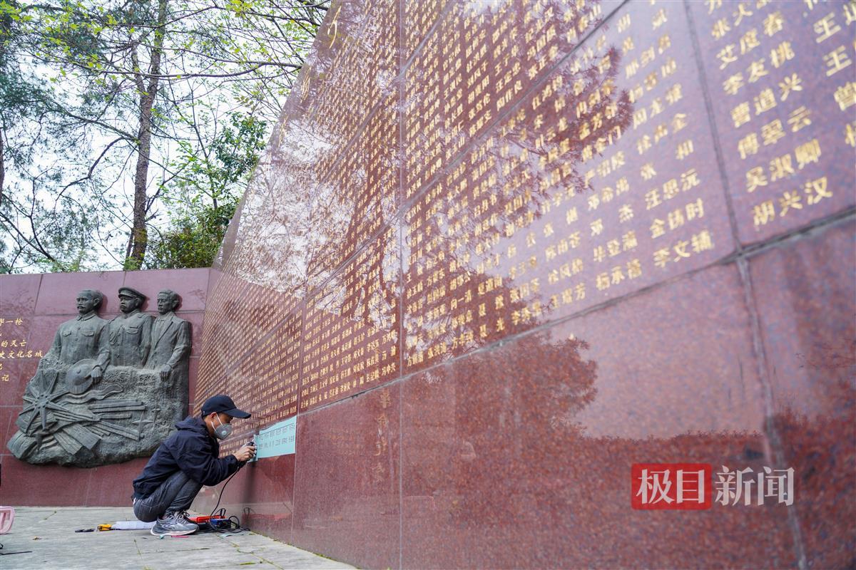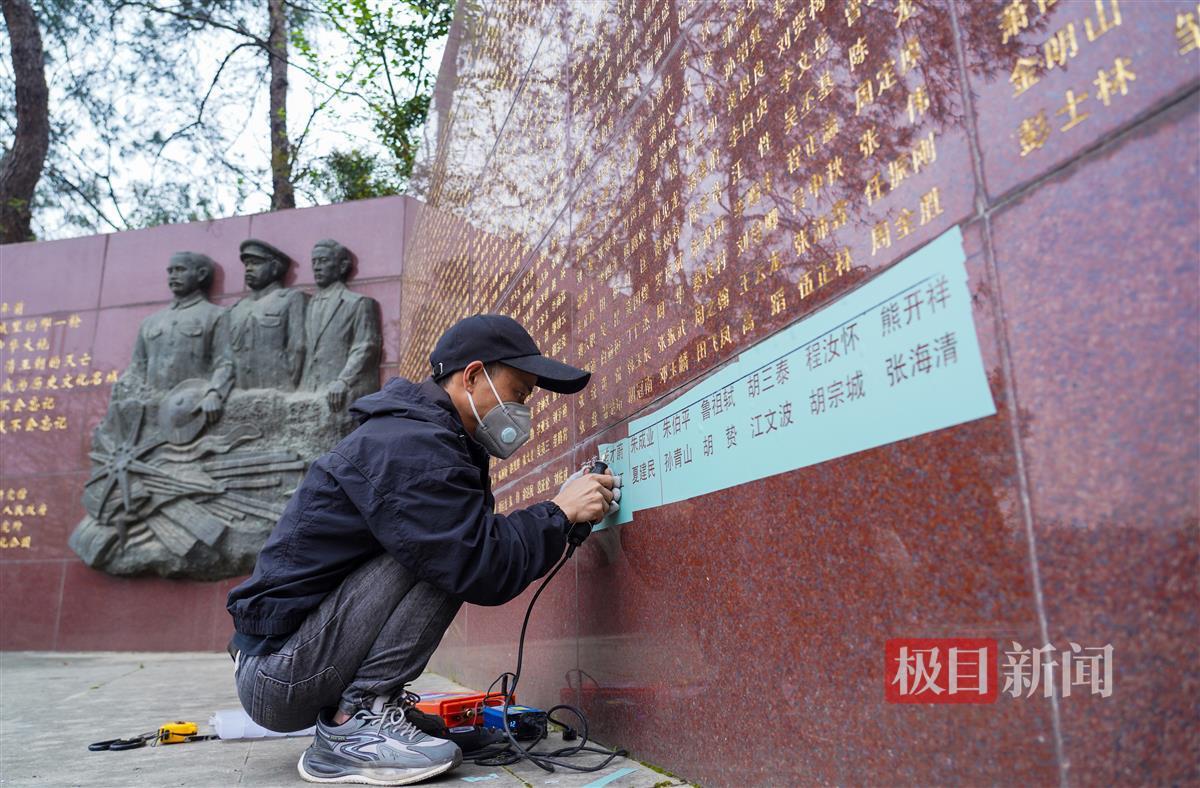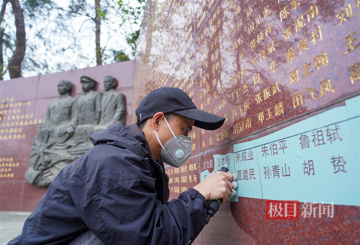 4月4日,清明时节。武汉石门峰纪念公园辛亥革命纪念园内,苍柏掩映。园内辛亥志士纪念墙角下,雕刻师王珍辉正一笔一划地将16名参加过辛亥革命的志士名字刻上去。他耐心细致,每个笔画都饱含敬意。
