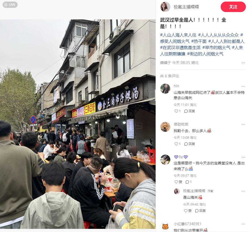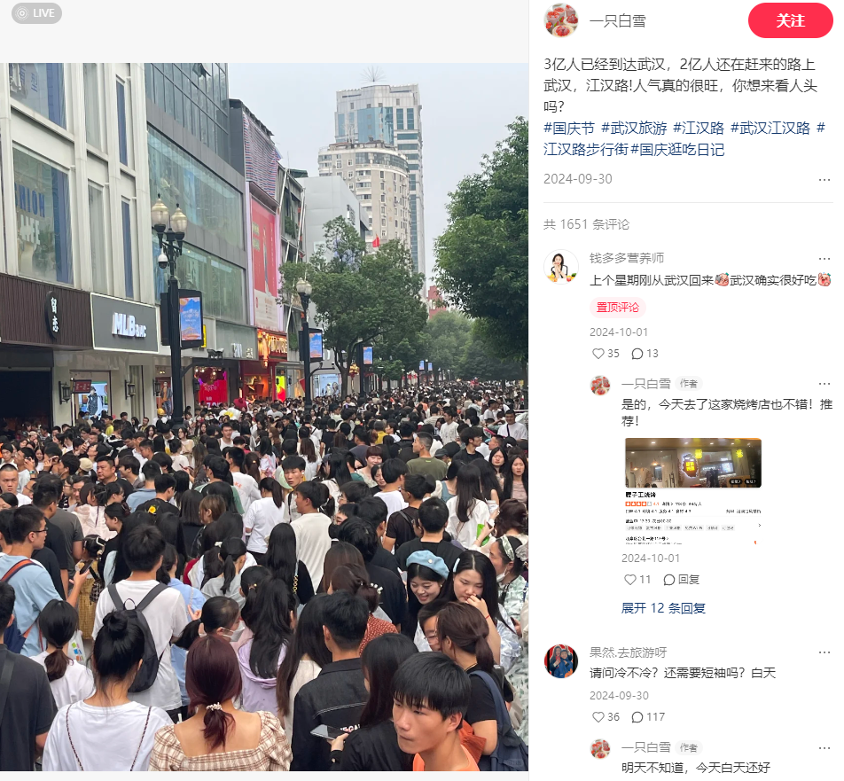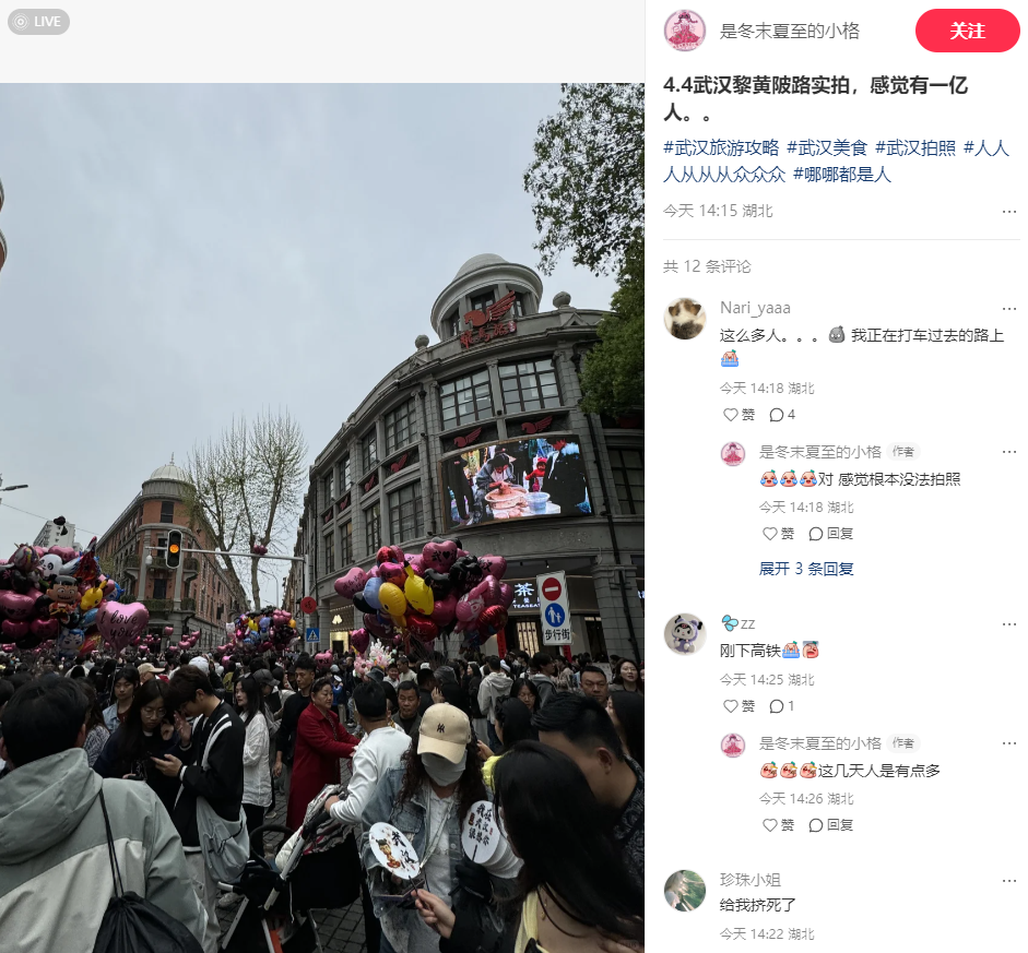 社交平台上,有网友直呼武汉#人挤人挤人挤人#:“3亿人已经到达武汉,2亿人还在赶来的路上”。
