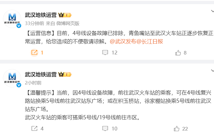 武汉地铁运营发布消息:目前,4号线设备故障已排除,青鱼嘴站至武汉火车站正逐步恢复正常运营,给您造成的不便敬请谅解。