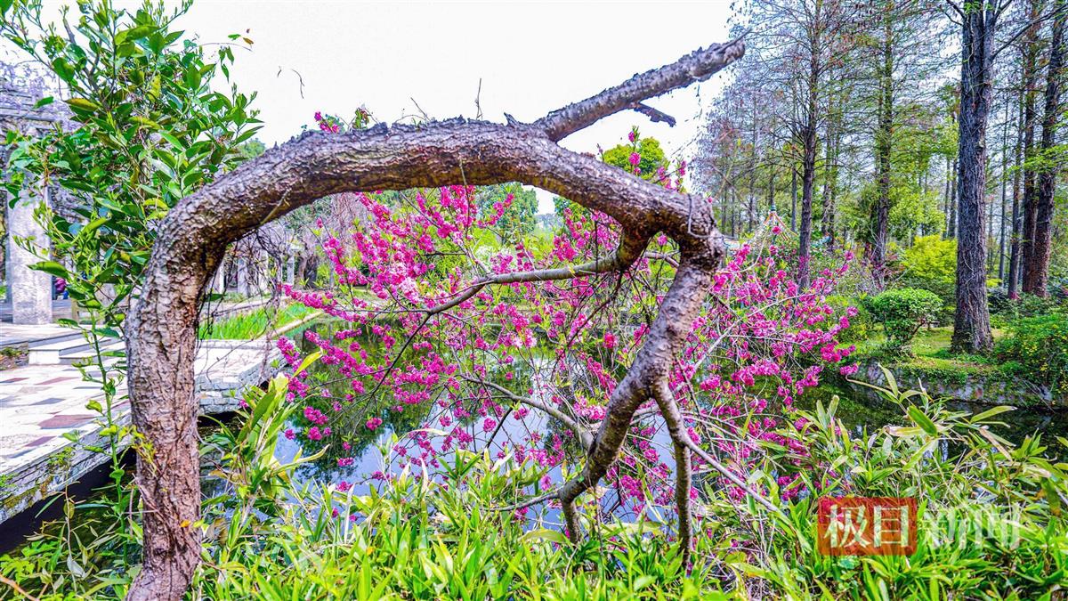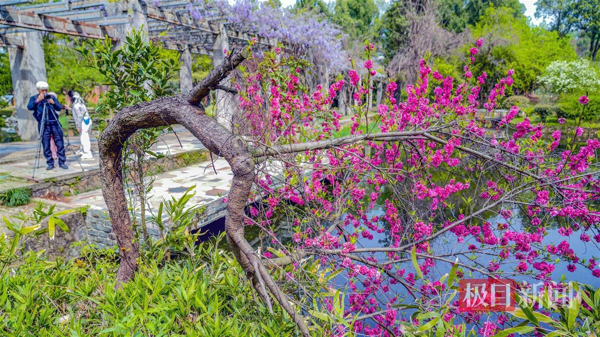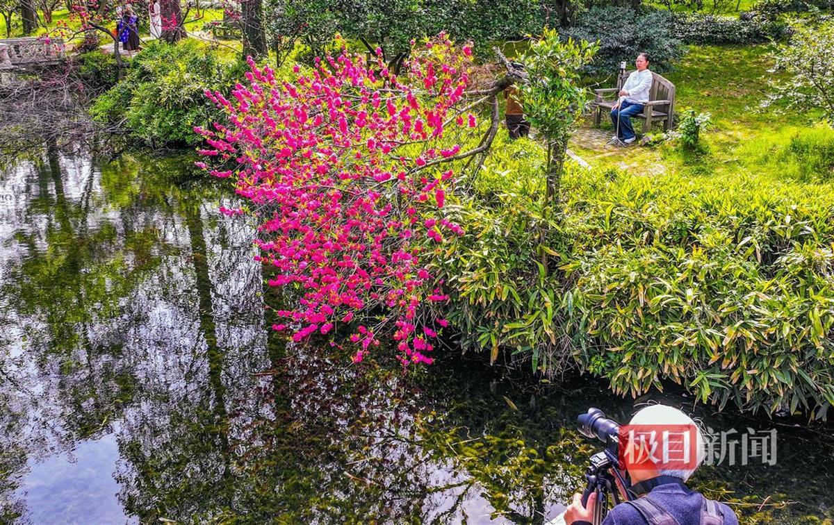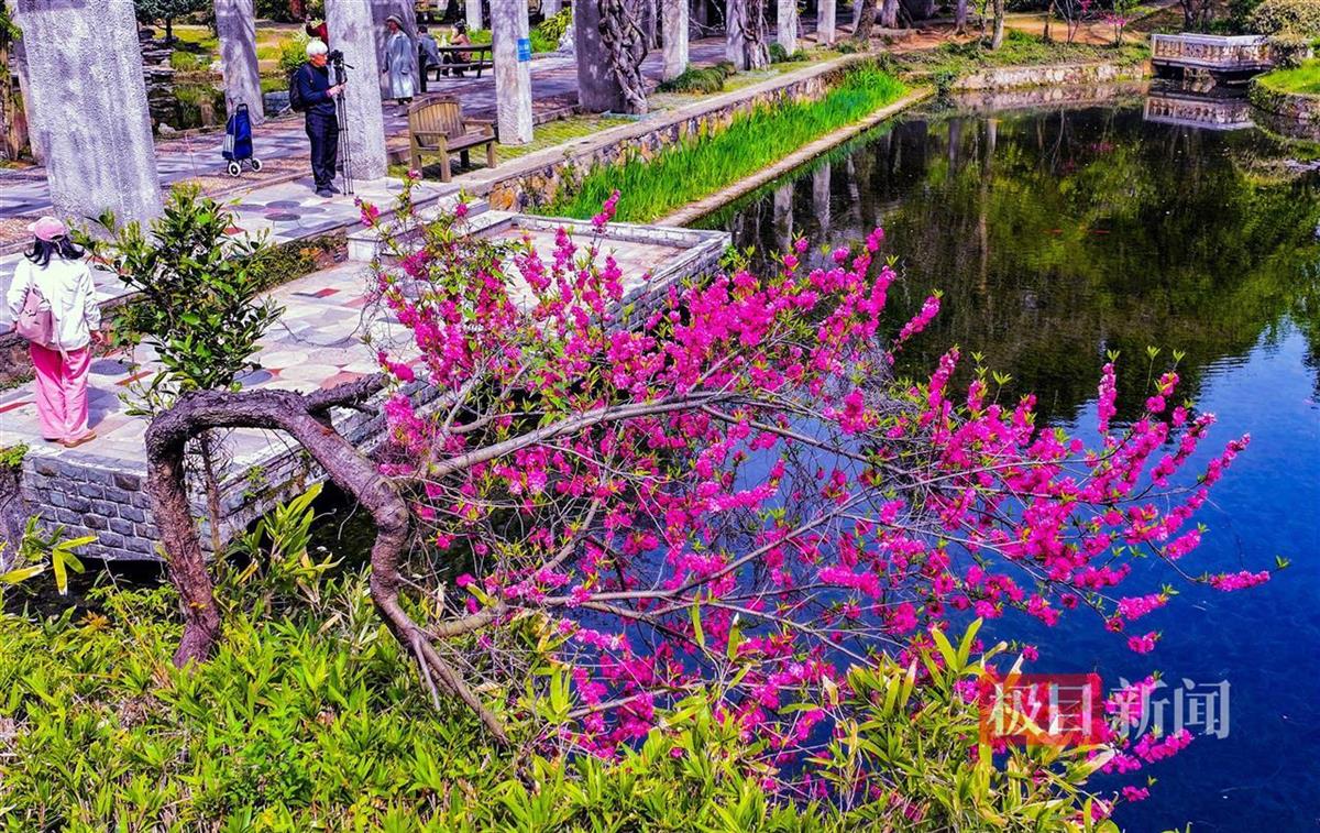 李女士和朋友们原计划是前往武汉植物园欣赏紫藤长廊,未料,在紫藤长廊旁的一湾水池遇到了惊喜:一树红润饱满的桃花弯腰伸向水面,像是一位窈窕淑女在梳妆照镜……