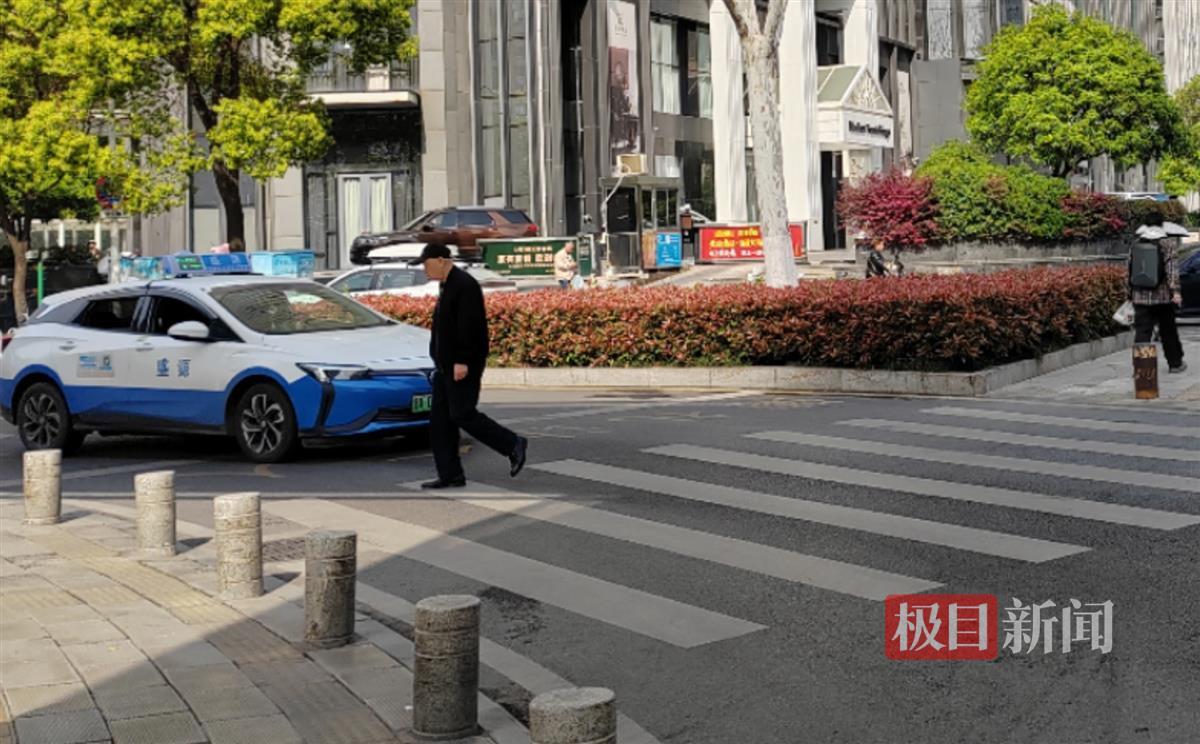 4月7日上午,在武昌汪家墩天桥正下方的一处斑马线上,多位居民结伴买完菜准备过街回家,其中有几位老年人行动缓慢,一辆网约车在距离斑马线还有20多米的地方就开始减速,最后稳稳停在斑马线前,待大家通过斑马线后,才启动离开。