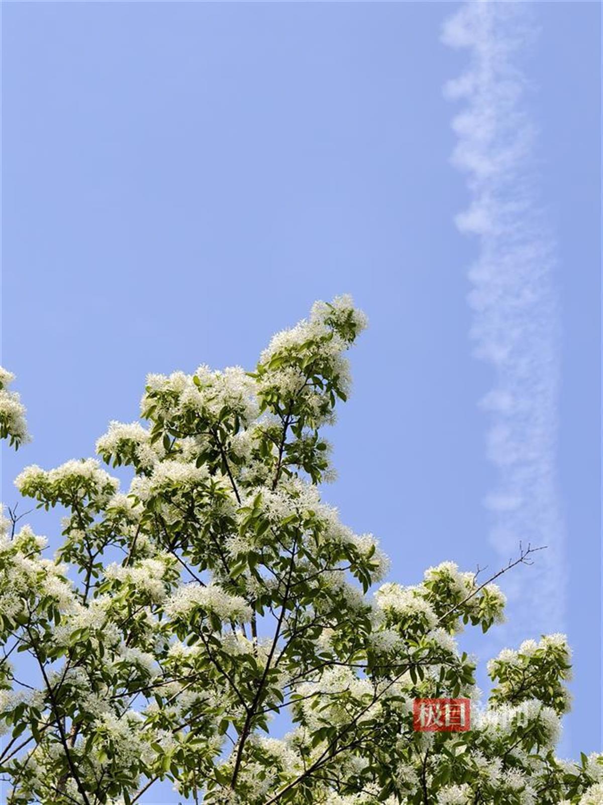 流苏树,又名“四月雪”,因花期在四月且花朵洁白如雪而得名,是国家二级保护植物。其树形高大优美,枝叶繁茂,花朵呈聚伞状,花瓣细长,如同古代仕女服饰上的流苏,故而得名。走进和平公园,远远便能望见两株高大的流苏树,繁茂的枝头上缀满白色花朵,细碎的花瓣在阳光照耀下闪烁着柔和光芒,如串串流苏随风轻摆,又似雪花挂满枝头,清新淡雅,美不胜收。微风拂过,花瓣纷纷飘落,仿佛下起一场浪漫的“花雪”,给公园增添一抹诗意与浪漫。