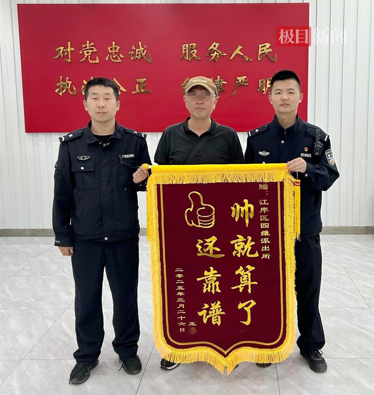 “谢谢警察同志,当晚报警求助后2个小时就帮我们连夜找回设备,真的太感谢你们了!”4月7日,王先生及其妻子来到武汉市公安局江岸区分局四唯街派出所,向民警赠送一面印着“帅就算了,还靠谱”的锦旗。