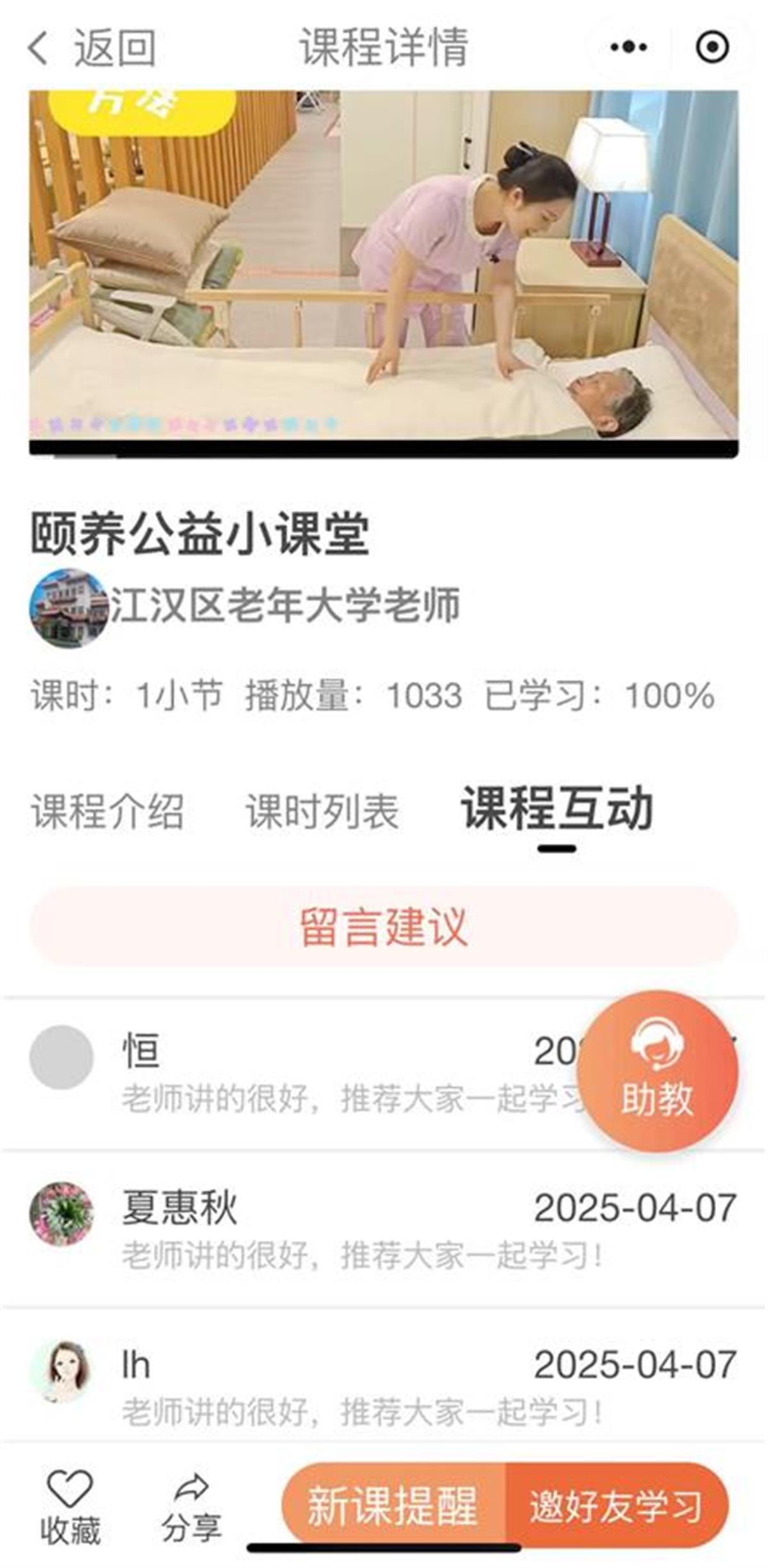 目前,“颐养江汉”公益小课堂已上线武汉数字化老年大学快乐银杏林小程序,计划推出辅导视频课程18讲,内容覆盖老年人日常护理、康复保健、用药护理等多个关键板块,以实操视频的方式全过程、精细化地讲解失能老人居家照护的重要内容,传授简单实用的照护专业技能。