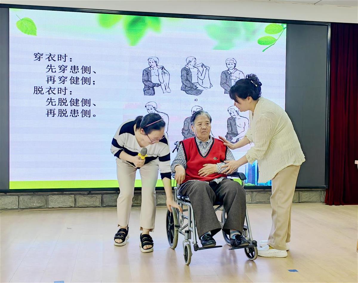 “穿衣要先穿患侧后穿健侧,脱衣则是相反……”4月9日上午9点,武汉江汉区常青街道复兴村社区4楼多功能室内,一场针对失能老人家庭的照护技能线下培训课展开,标志着“颐养江汉”公益小课堂正式开课。