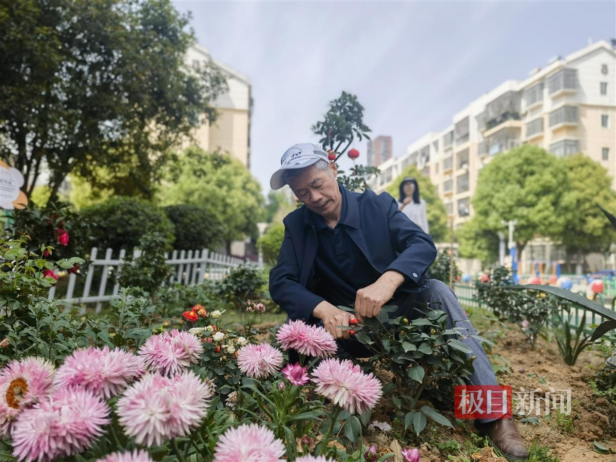 4月初,气温逐渐升高,花草加速生长。在武汉东湖高新区佛祖岭街大舒社区14栋3单元一楼门口外,一片被绿意和鲜花簇拥的10余平方米花园里,居民舒邦威身着藏蓝色外套、头戴白色帽子的老者,蹲在花草中,双手握住园艺剪刀,修剪掉没有长花苞的侧枝,动作舒缓而细致。