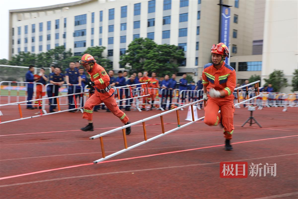 消防员王亢(右)积极参加训练比武