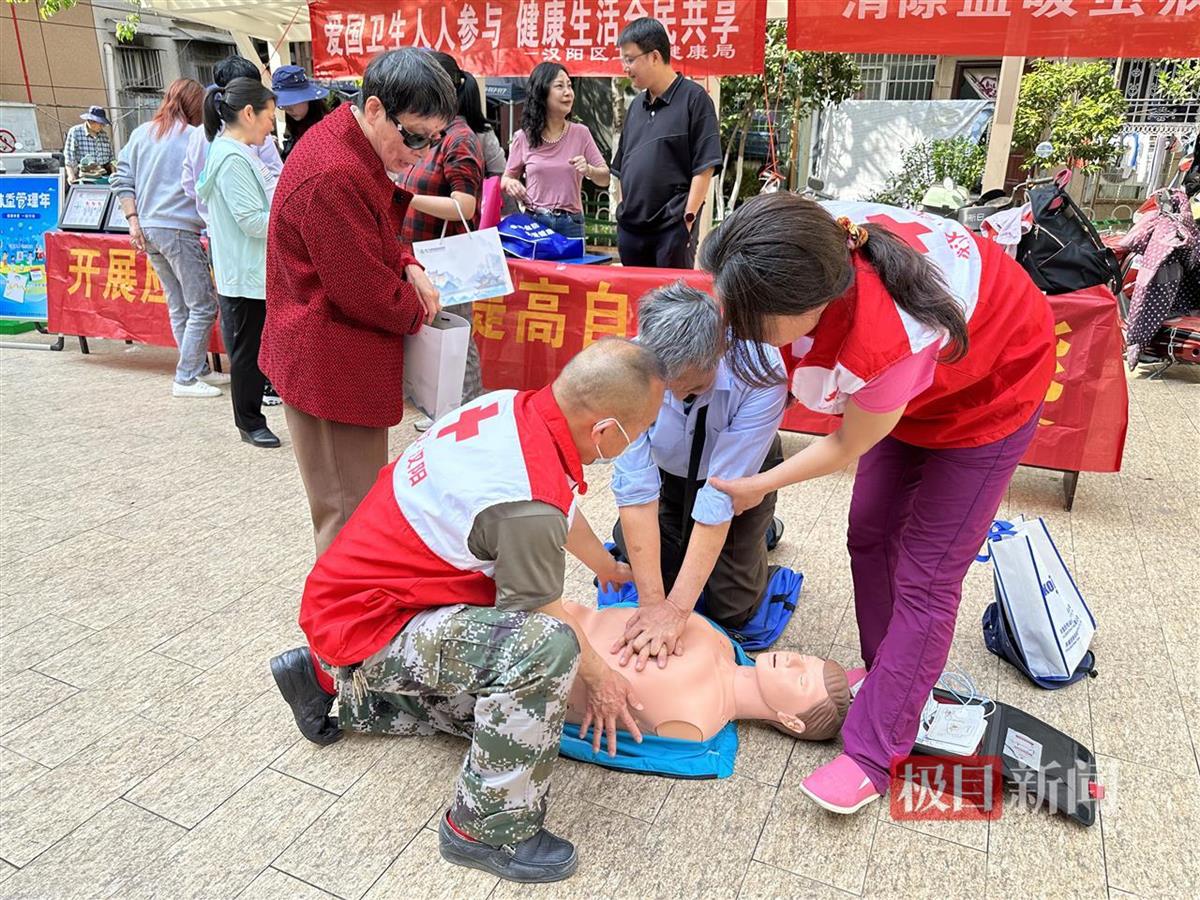 活动现场,各医疗机构的专业医护人员为居民们提供了丰富多样的义诊项目:武汉市中医院汉阳院区开展中医药相关宣传活动,帮助居民树立正确的养生观念,为居民免费测量体重和血压;武汉市第五医院和汉阳区妇幼保健院认真为居民诊断病情、答疑解惑,并根据检查结果给予个性化的健康指导和治疗建议;爱尔眼科医院和清华阳光口腔医院为居民免费进行眼科视力筛查、口腔健康检查,并贴心地送上小礼品;区疾控中心的工作人员还为居民带来了急救知识与技能培训,通过现场演示心肺复苏(CPR)、海姆立克急救法等常见急救操作,并邀请居民现场实操练习,手把手指导纠正动作,让大家初步掌握了应对突发状况的急救技能,有效提升了居民的应急处置能力。