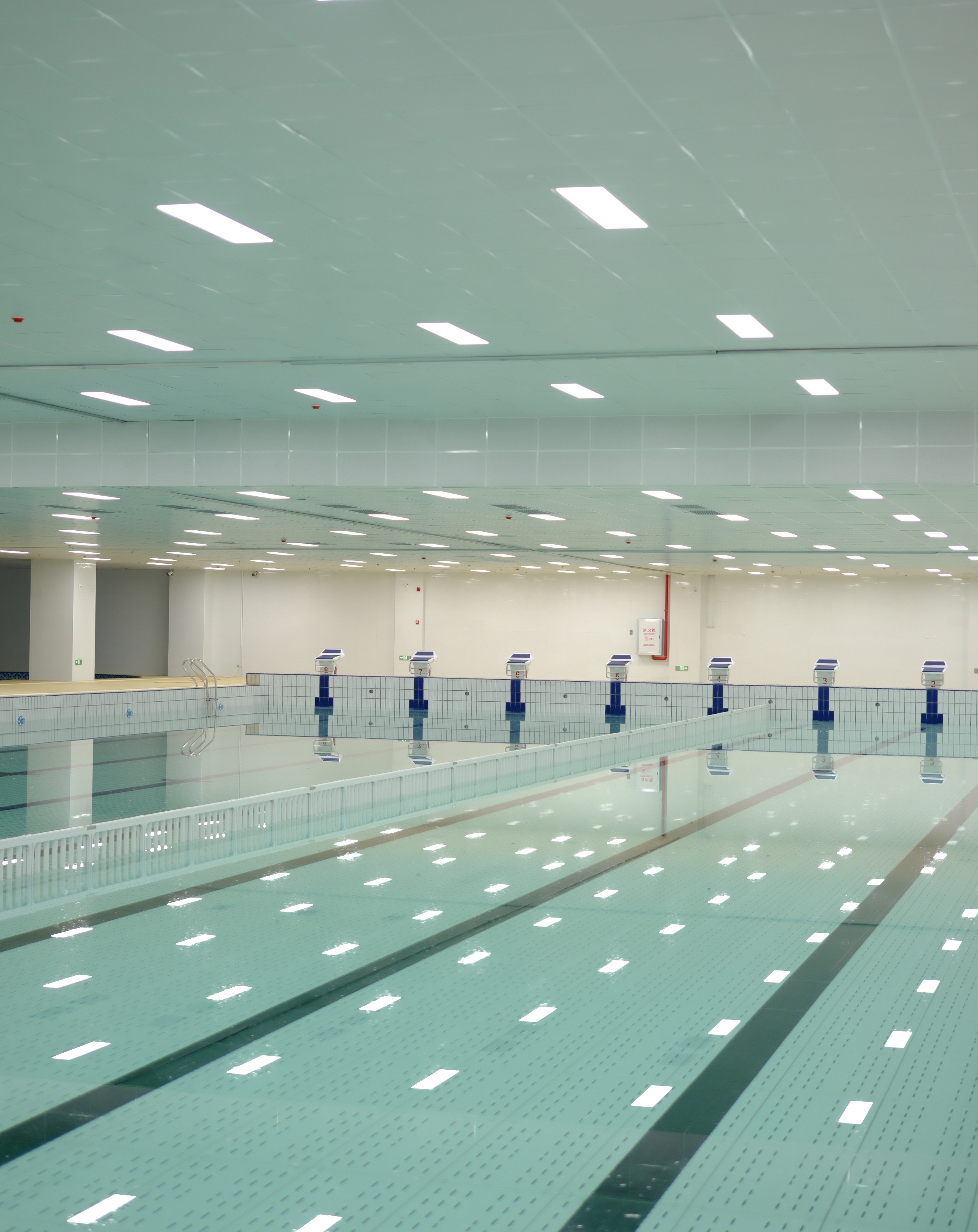恒温游泳池为一座标准游泳池,有8条泳道。现正在进行设备调试,开放时间将于近期公布。