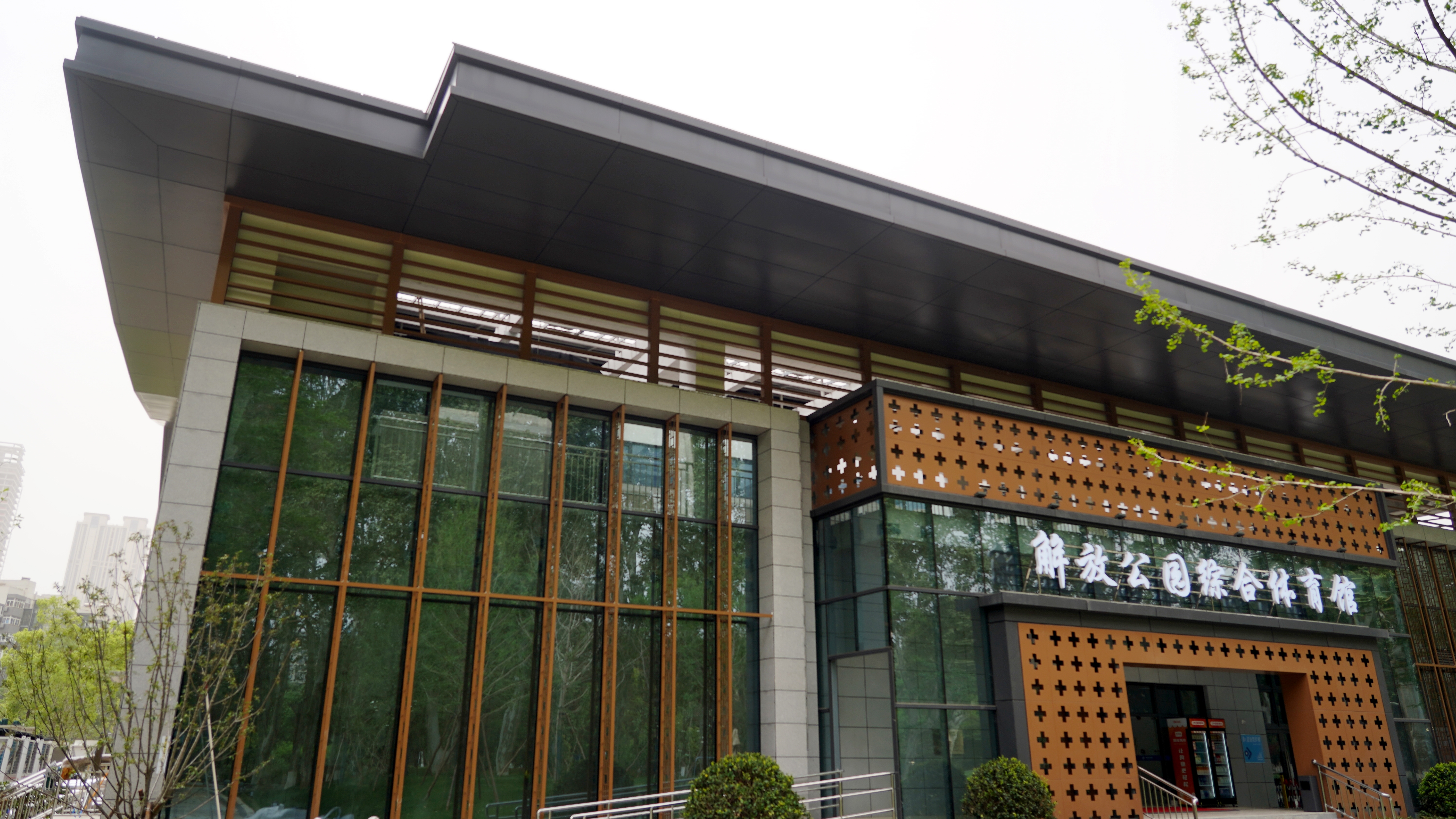 解放公园综合体育馆位于嘉卉广场南侧,由原露天游泳池改建而成。馆内分为地上、地下两层,地上为羽毛球馆,地下为恒温游泳池。
