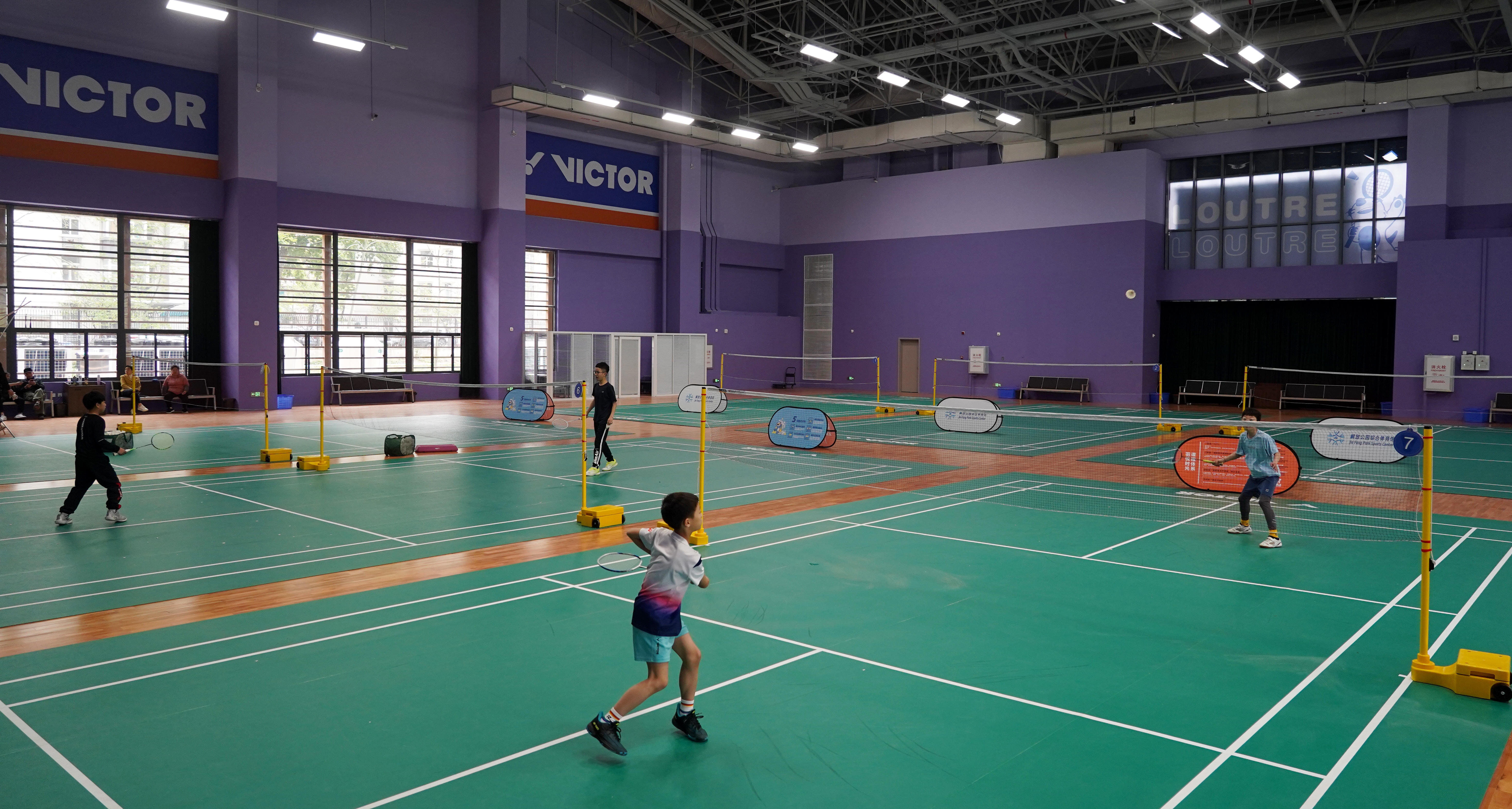 馆长陈娜介绍,羽毛球馆面积1300平方米,建有8片标准羽毛球场。地面铺设双龙骨木地板,弹性良好。羽毛球场铺设维克多运动地胶,打球时可防滑。顶棚装有双侧打光灯,可防炫目。墙面漆成紫罗兰色,方便打球时看清头顶来球。
