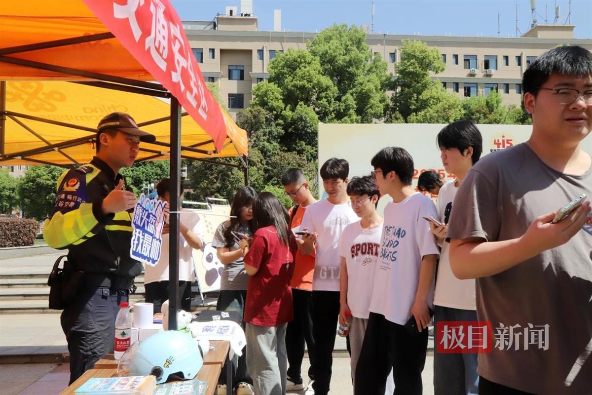 会场外,多个宣传展台整齐铺开,毒品仿真品、诈骗话术本、消防灭火器等展品整齐排列,吸引路过师生驻足。东湖高新公安分局刑侦大队、人口大队、交通大队等部门组成“专家顾问团”联合消防大队,通过发放宣传资料、展出展板、现场讲解等方式为师生提供法律咨询,开展交通、禁毒、反诈、消防等安全防范宣传。师生们积极参与,气氛热烈。