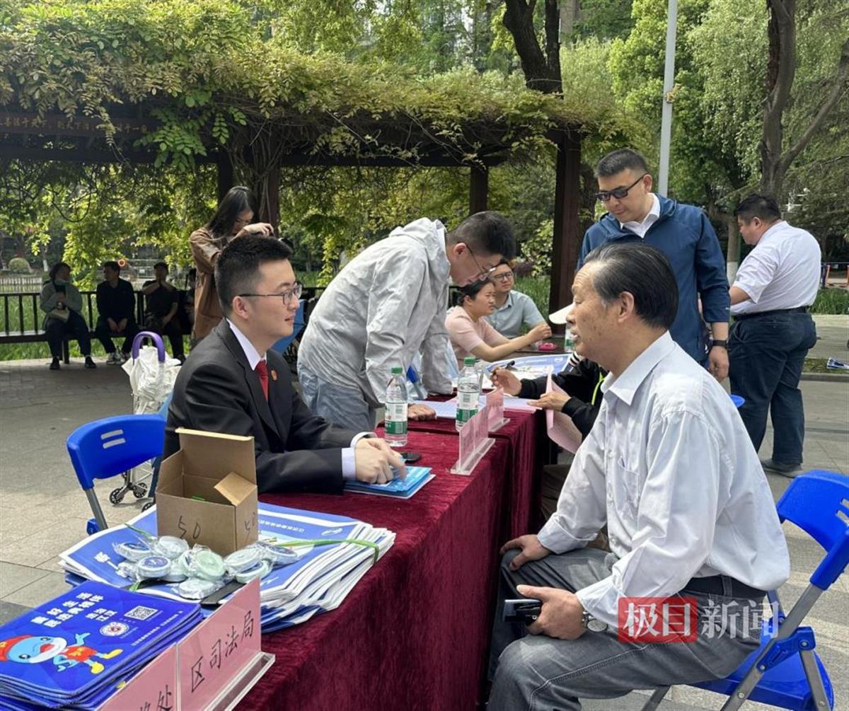 小南湖公园的中心广场上,人群熙熙攘攘。在法律咨询区,多家单位的工作人员、上海邦信阳(武汉)律师事务所的律师为居民群众答疑解惑,并围绕国家安全、民族宗教、民法典、禁毒、反诈等主题开展普法宣传,现场发放普法宣传资料和宣传品400余份。